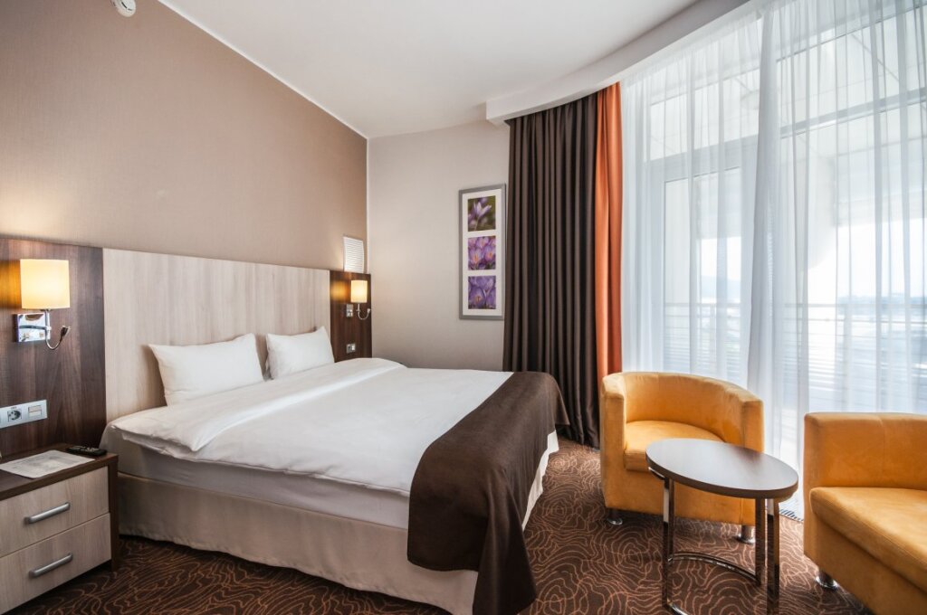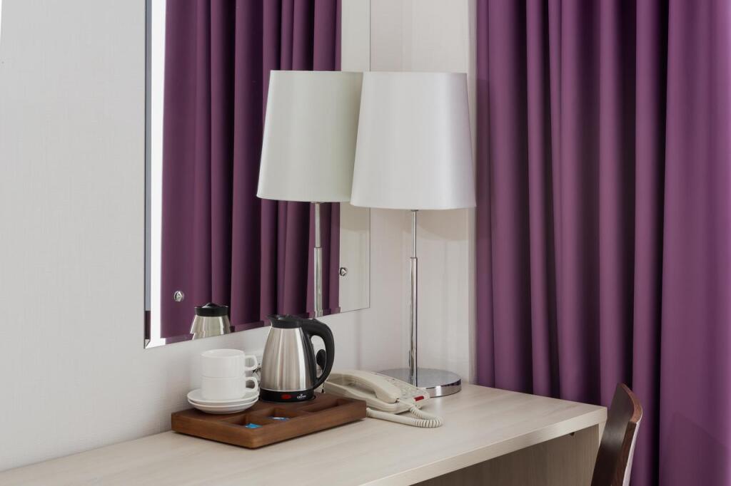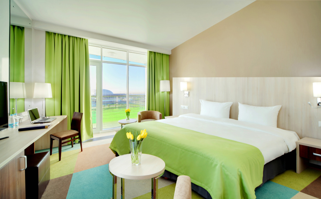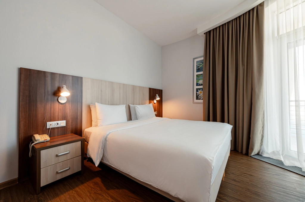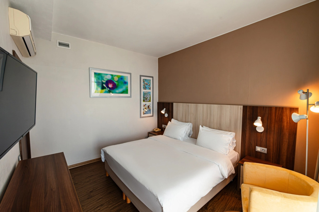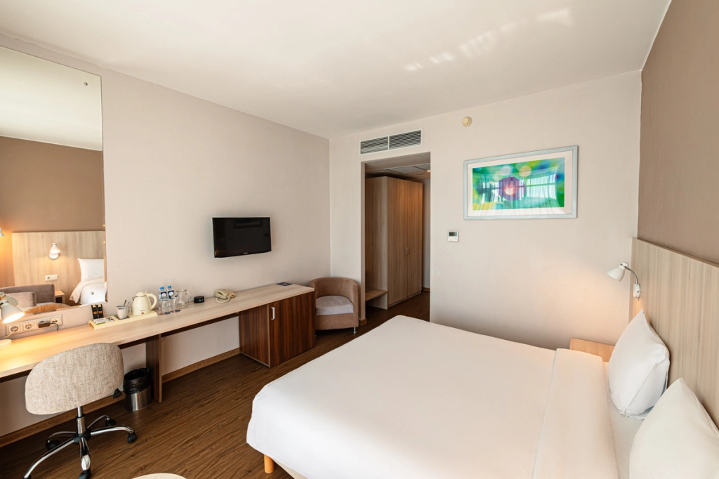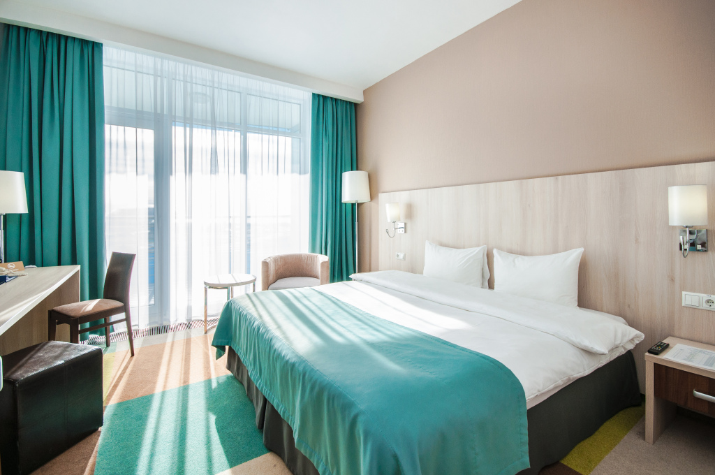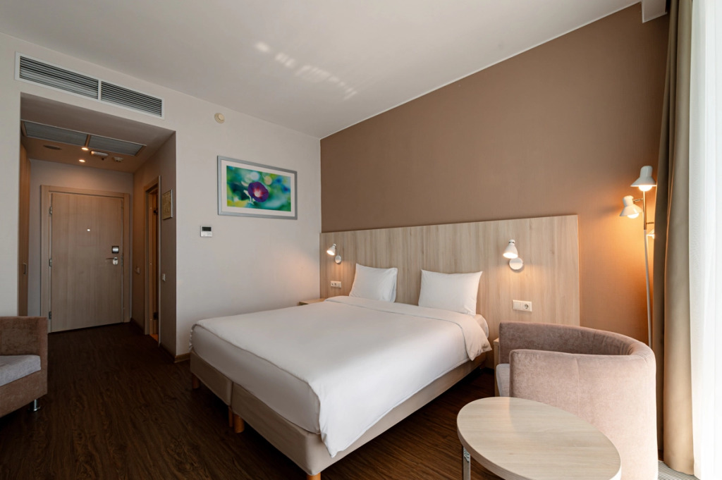 Во всех номерах категории «Стандарт с двуспальной кроватью» кровать состоит из двух односпальных кроватей, соединённых топпером.