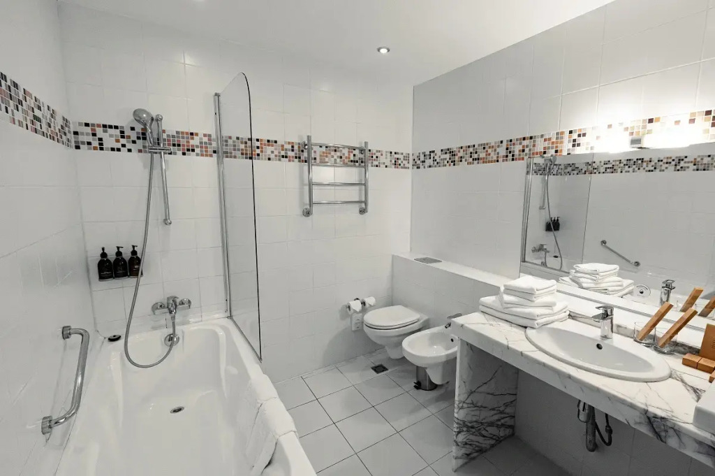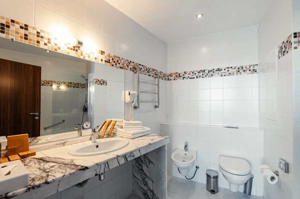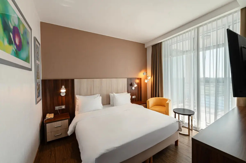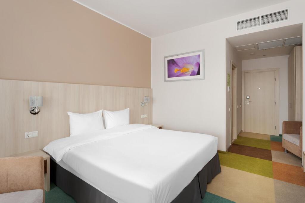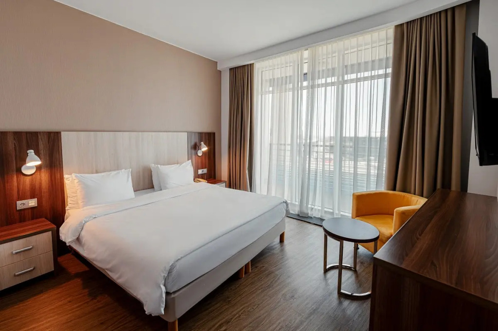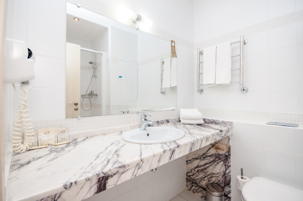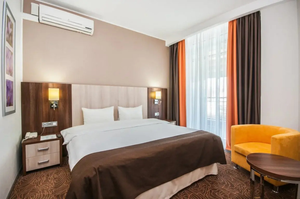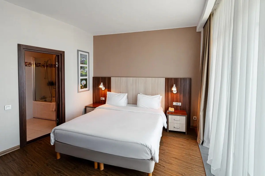 Во всех номерах категории «Стандарт с двуспальной кроватью» кровать состоит из двух односпальных кроватей, соединённых топпером.