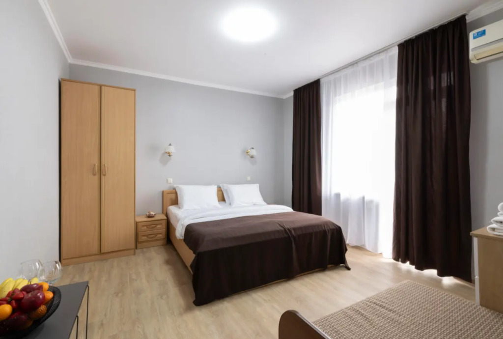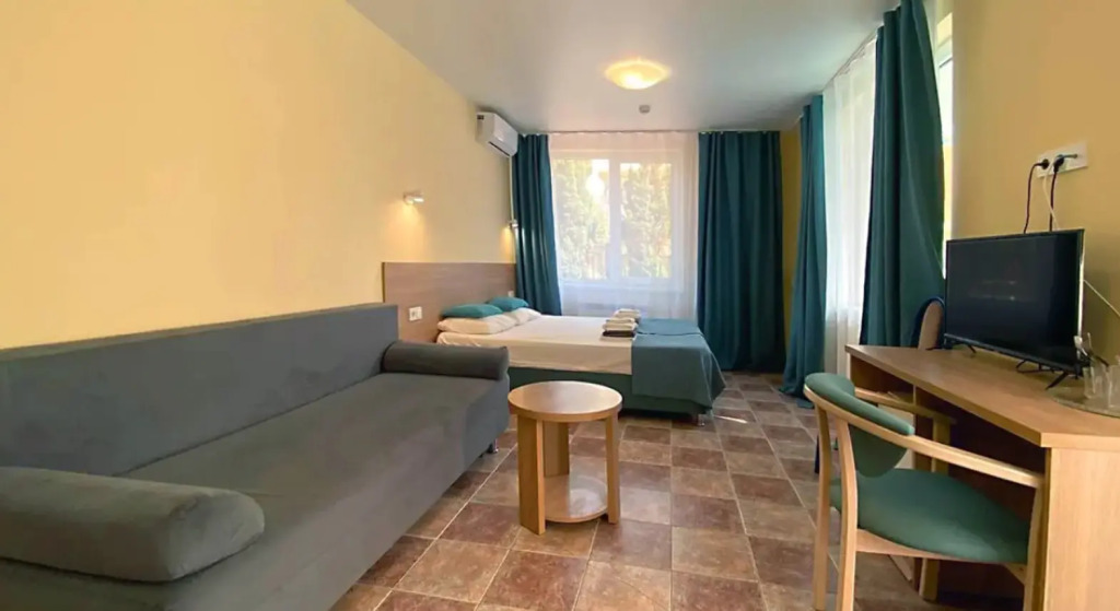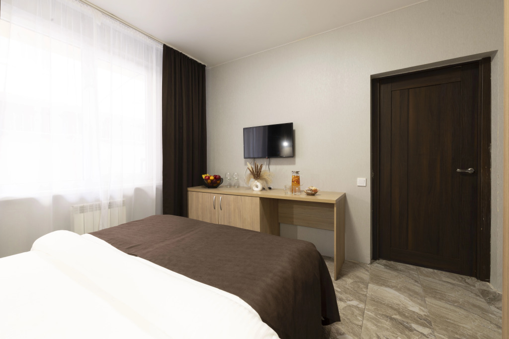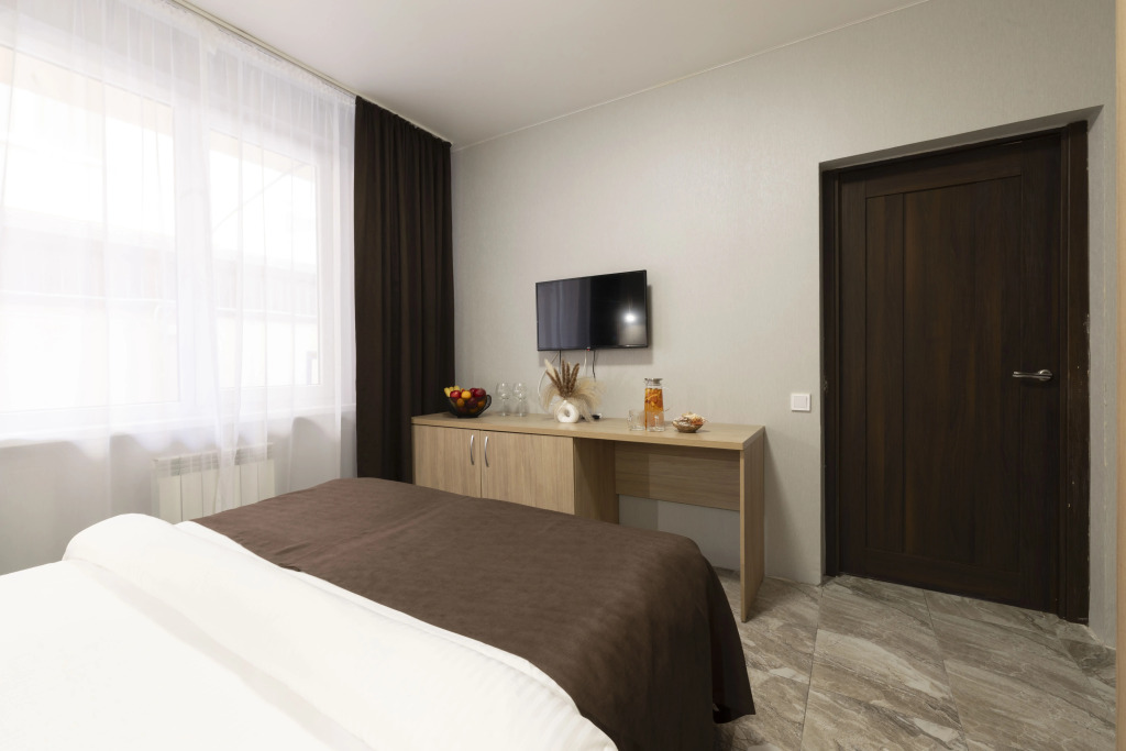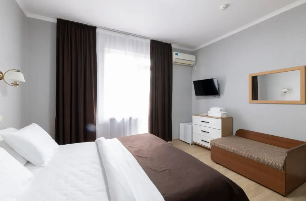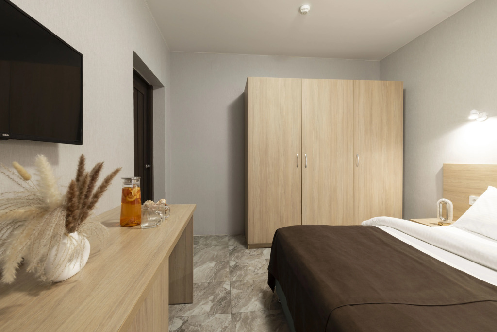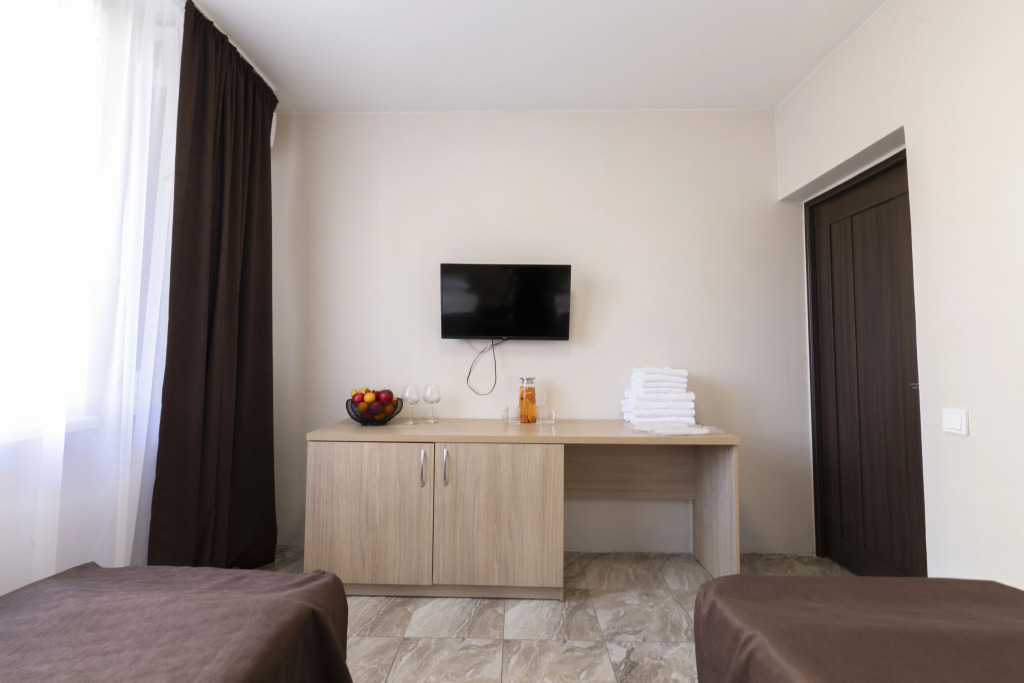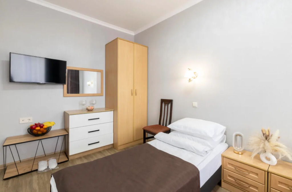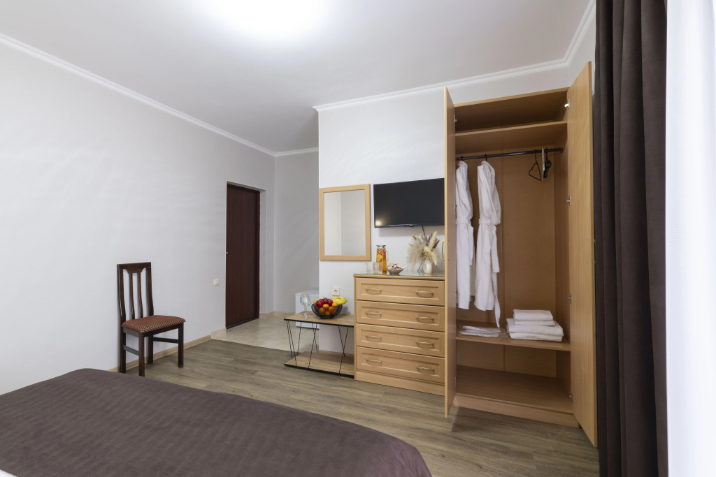 Номер уютно обставлен и оснащён необходимым, чтобы отдохнуть после долгого и насыщенного дня. Имеются телевизор и халат. Оснащение зависит от выбранной категории номера.