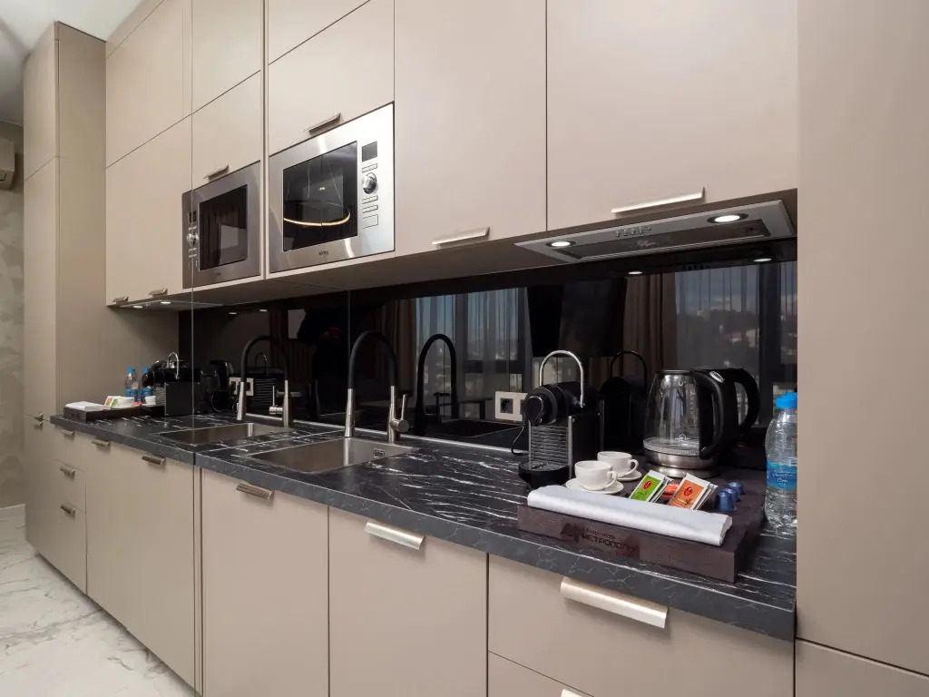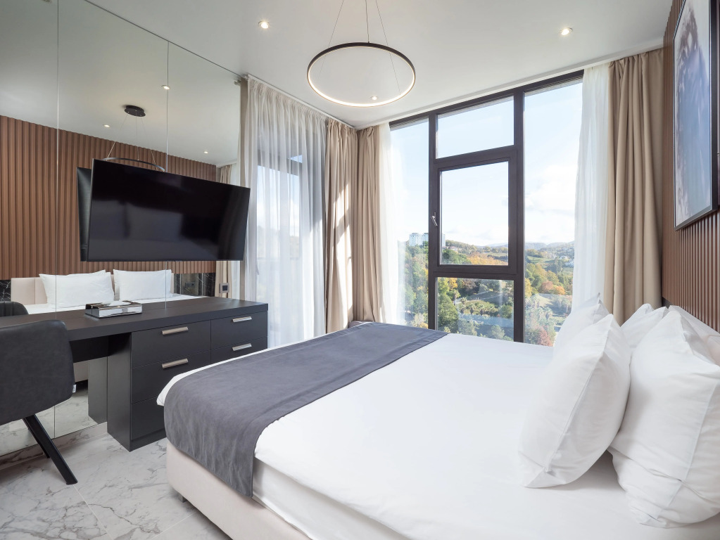 Для бронирования доступны апартаменты различных категорий от студий, оборудованных всем необходимым, до апартаментов повышенной комфортности категорий «Люкс». На всей территории работает бесплатный Wi-Fi. В стоимость проживания входит посещение тренажёрного зала, который работает круглосуточно, занятия йогой по расписанию, пользование лаунж-зоной расположенной на 17 этаже. На оборудованной крыше к услугам гостей также доступен концептуальный бассейн с панорамным видом на море и горы. Бассейн работает сезонно, не подогреваемый, глубина 60 см. Также к услугам гостей тренажёрный комплекс, спортивная площадка с инвентарём для игр в баскетбол, футбол, волейбол, бадминтон, большой и маленький теннис. В понедельник – санитарный день, посещение крыши не доступно.