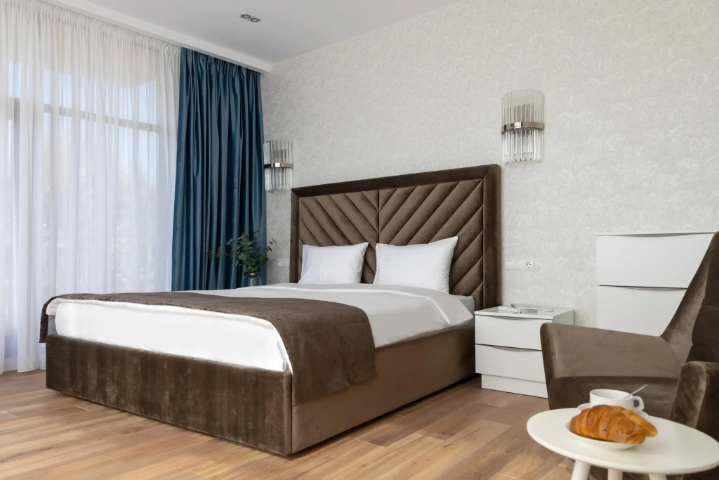 Из номеров открывается вид на сквер или на город. Оснащение зависит от выбранной категории номера.