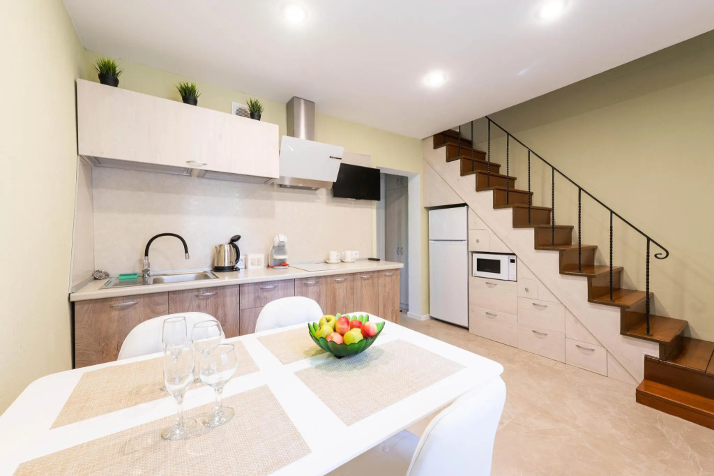 Удобное расположение между Пятерочкой и КБ. Также рядом аптека, кафе. До моря идти недолго. Рядом подвесной мостик через реку. Шикарный балкон со столиком, стульями и сушилкой. Мангальная зона. Нет мыла и шампуня. Также в номере не было мусорки в туалете, в других номерах были.