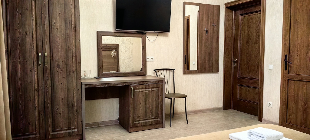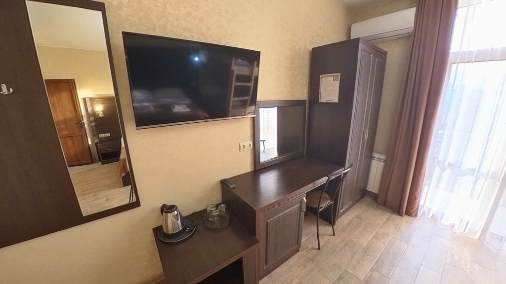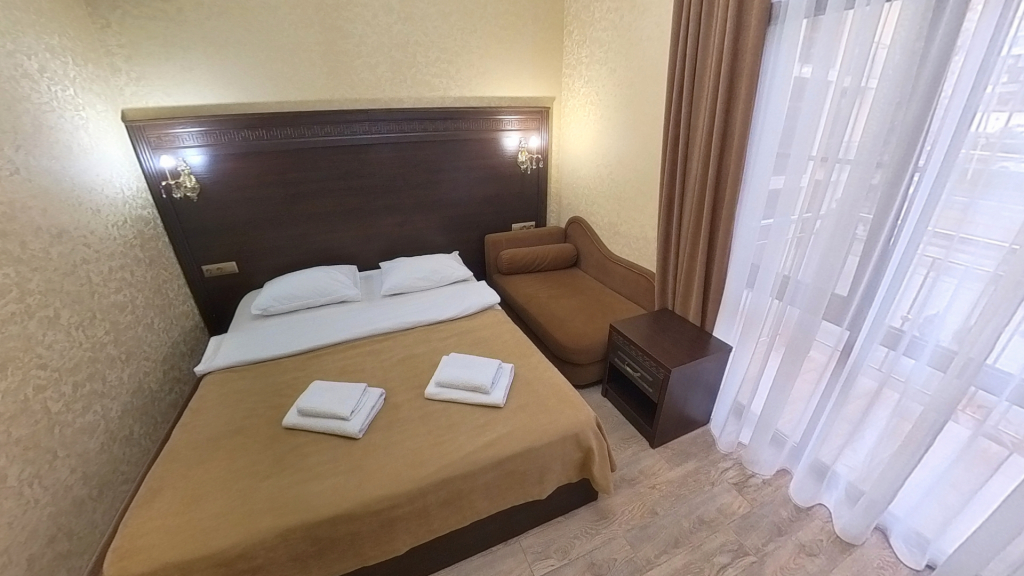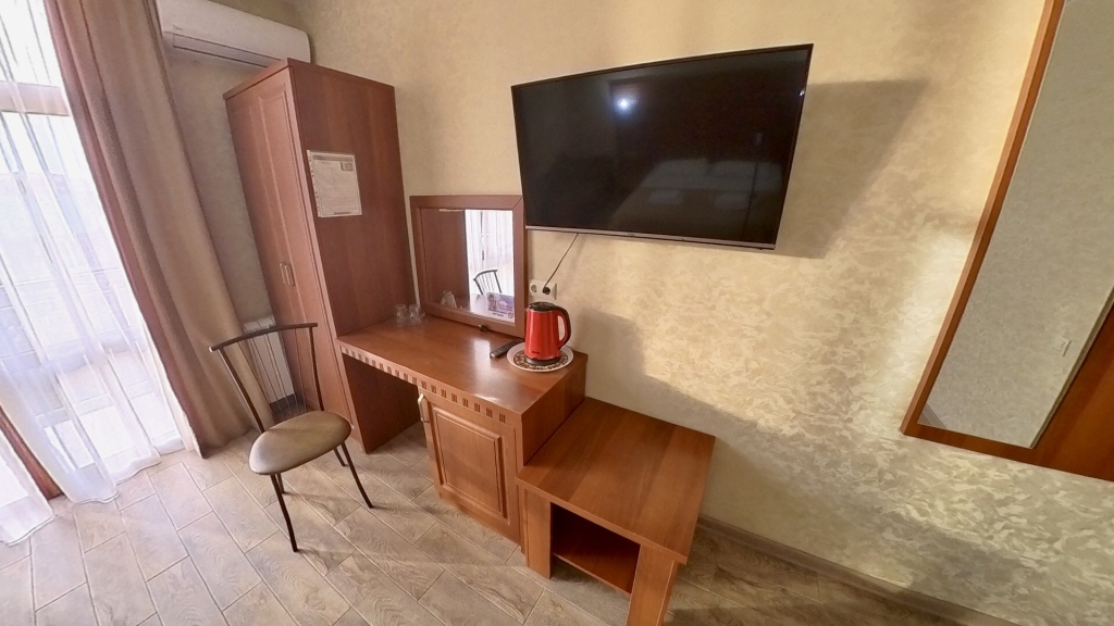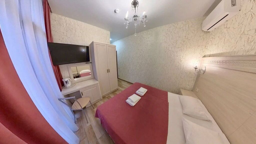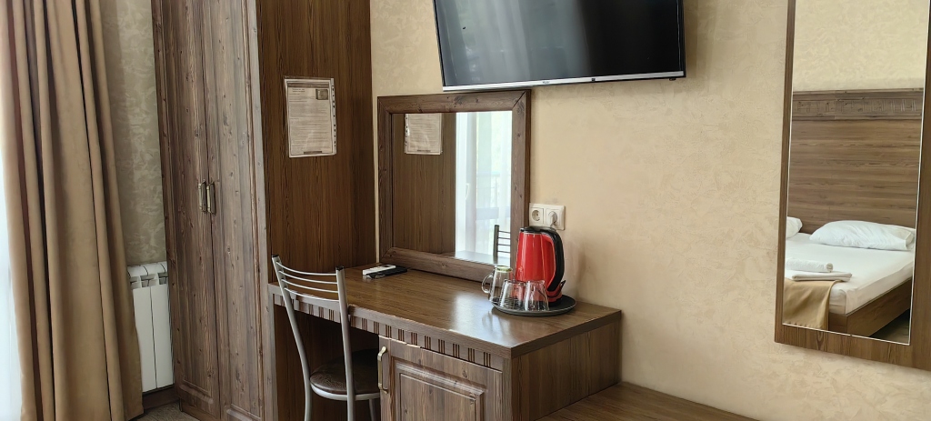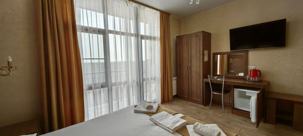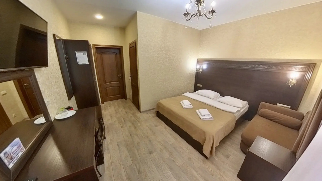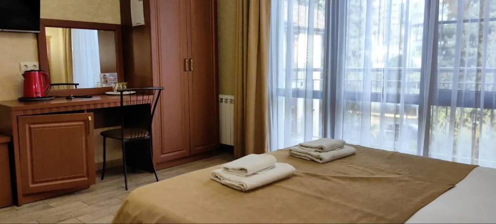 Номер уютно обставлен и оснащён необходимым, чтобы отдохнуть после долгого и насыщенного дня. Имеются телевизор и халат. Оснащение зависит от выбранной категории номера.