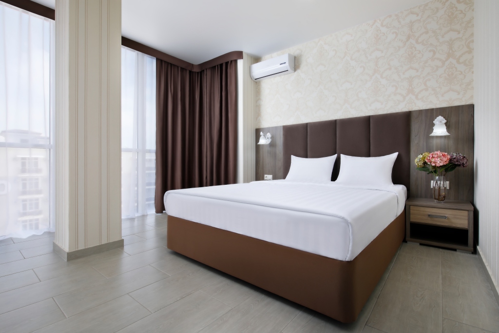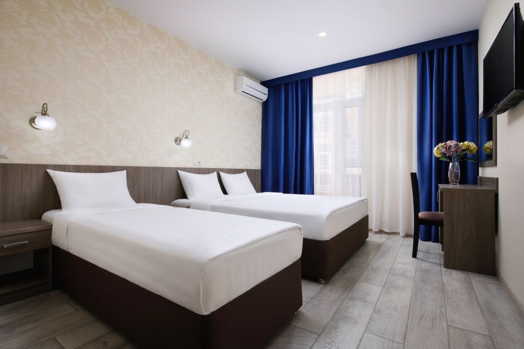 Кондиционер и телевизор. Для ребенка очень удобный диванчик,уборка производилась по просьбе,мусор выносят всегда. Шторы блэкаут -очень круто) В номере уютно)
