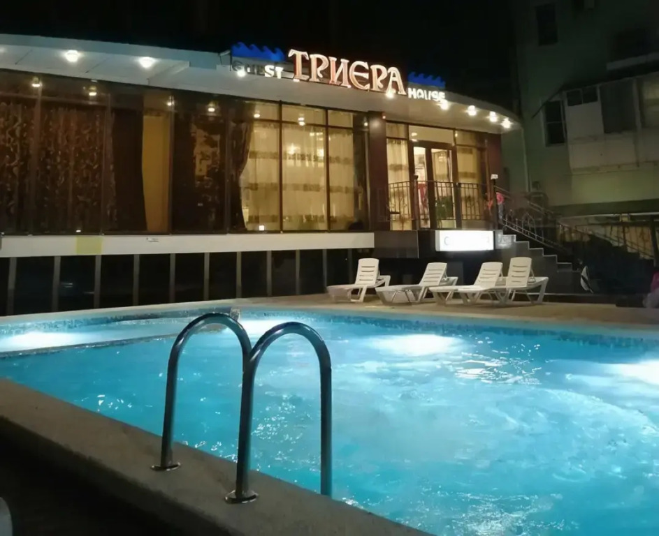 Место для отдыха после погони за впечатлениями! Отель «Triera» располагается в Витязево. Этот отель находится в самом центре города. Перед сном есть возможность прогуляться вдоль главных достопримечательностей. Рядом с отелем можно прогуляться. Неподалёку: Набережная Паралия, Аквапарк Олимпия и Пляж санатория «Вита».