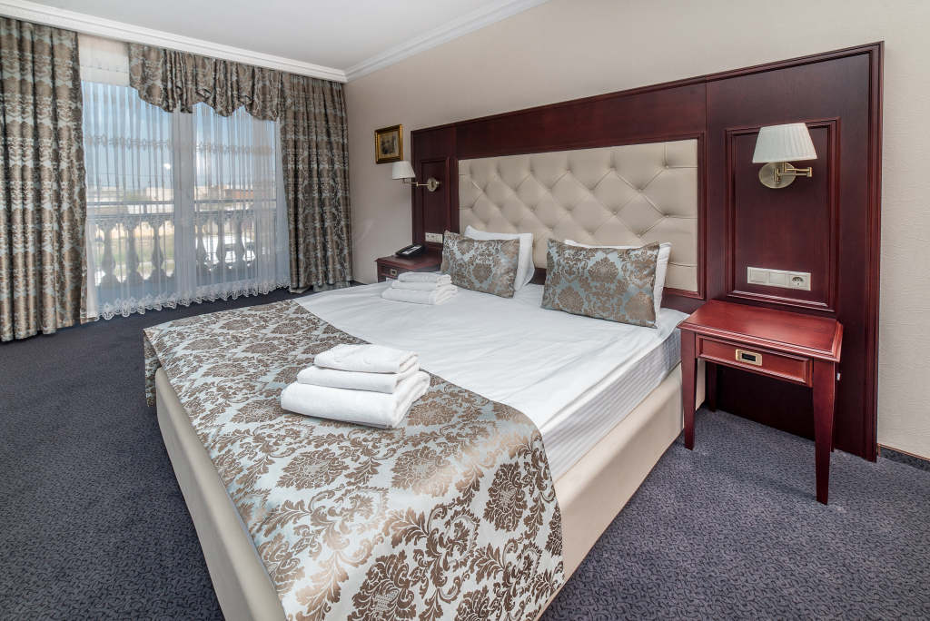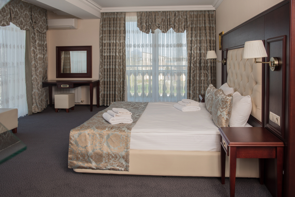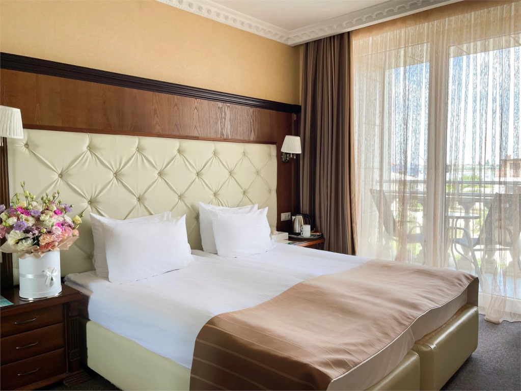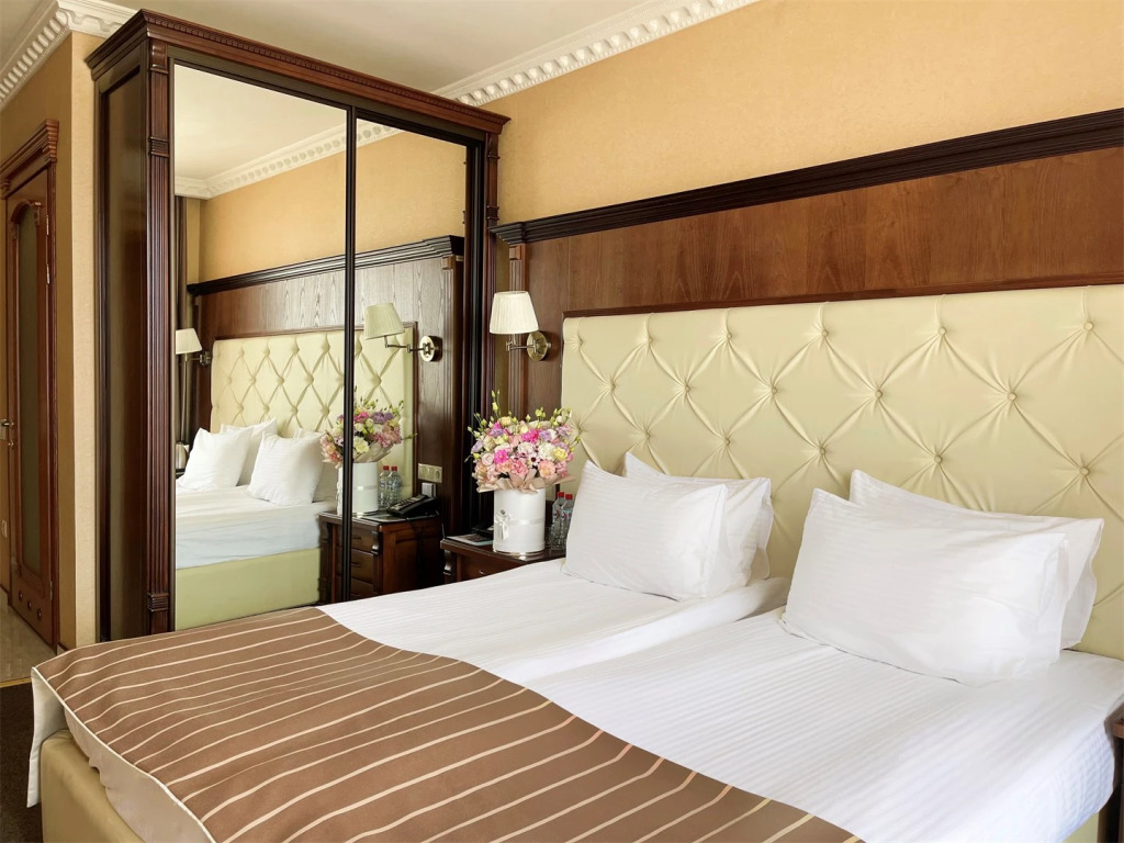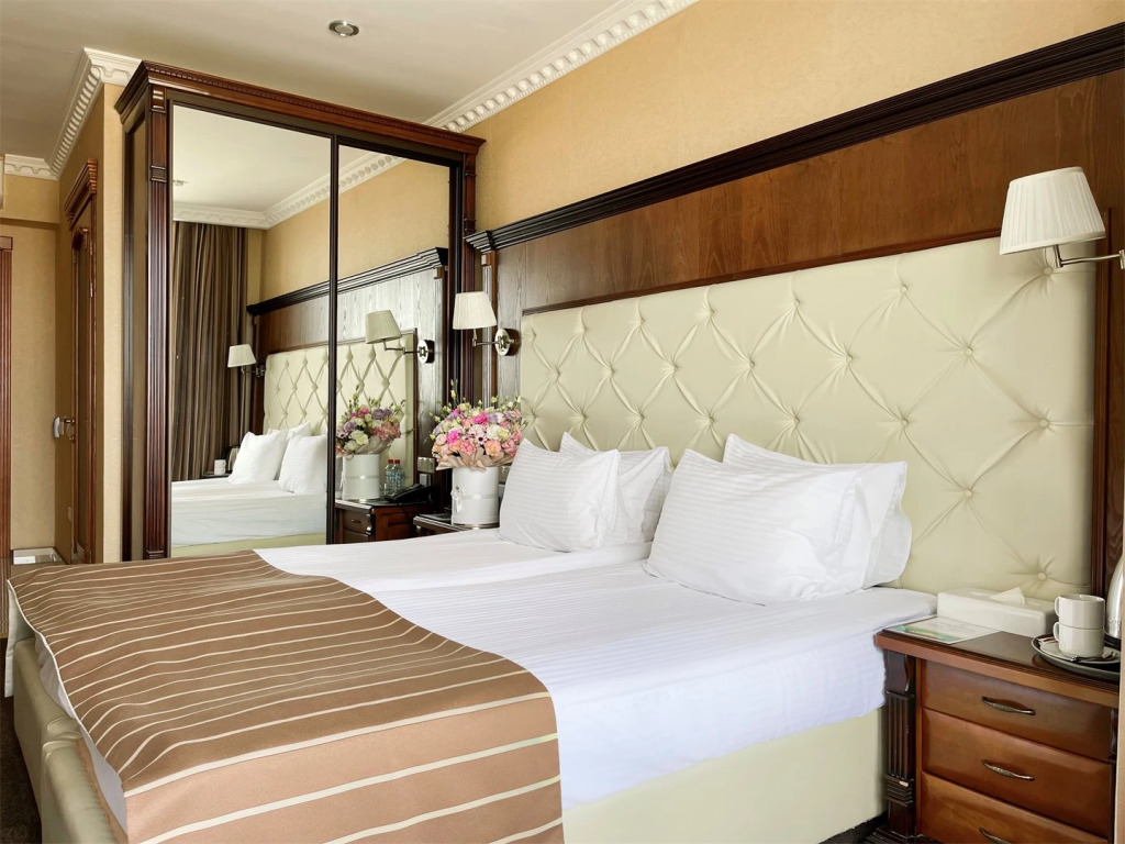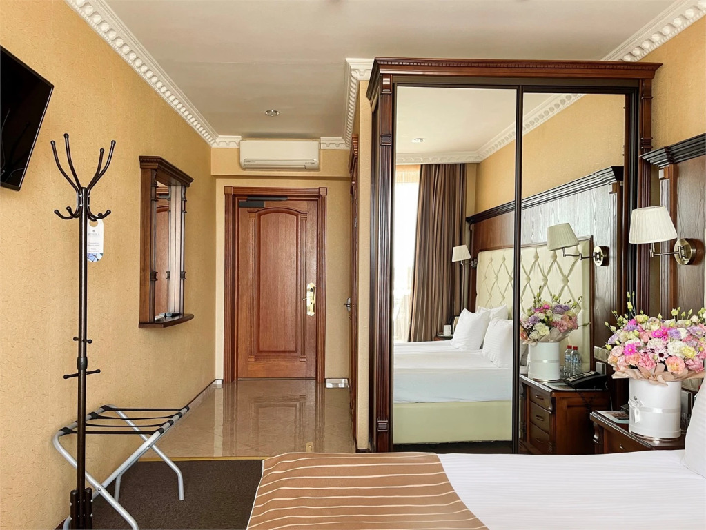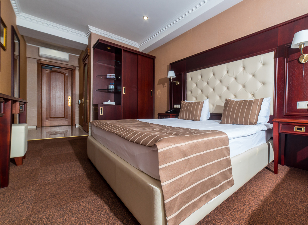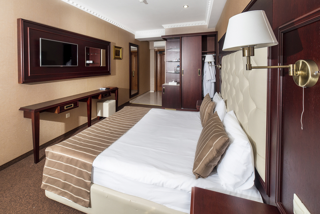 Чтобы вы могли отдохнуть после долгого дня, в номере есть телевизор, мини-бар, халат и тапочки. Оснащение зависит от выбранной категории номера.