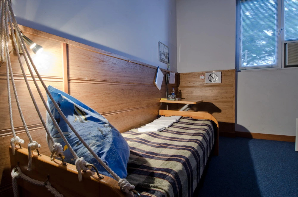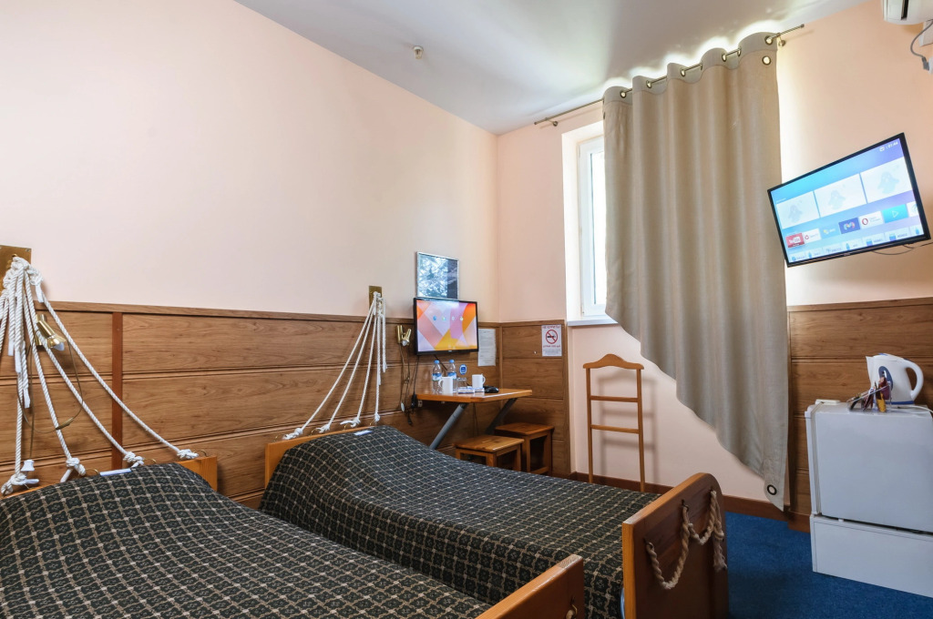 Отель стилизован под крейсер «Аврора», изображение которого украшает фасад здания. В коридоре и на лестницах отеля гости могут увидить фото шедевров мирового кораблестроения с их тактико-техническими данными.