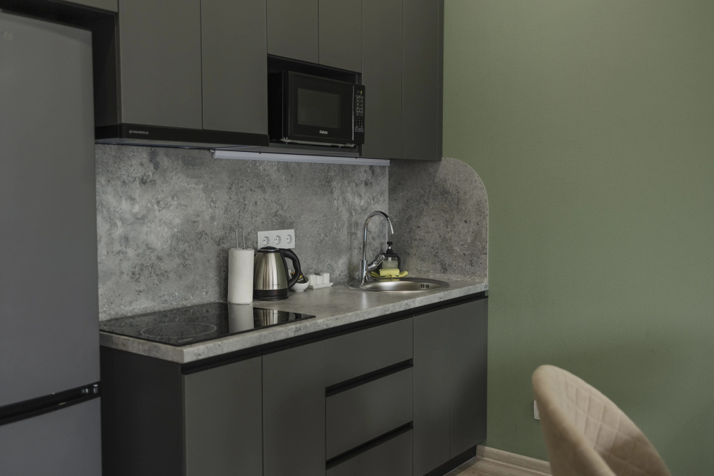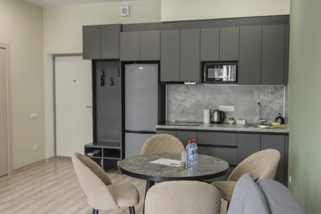 Отель предлагает номерной фонд с апартаментами площадью от 40 кв. м. Каждый номер оснащён собственной кухней, включая все необходимое оборудование, технику и посуду.