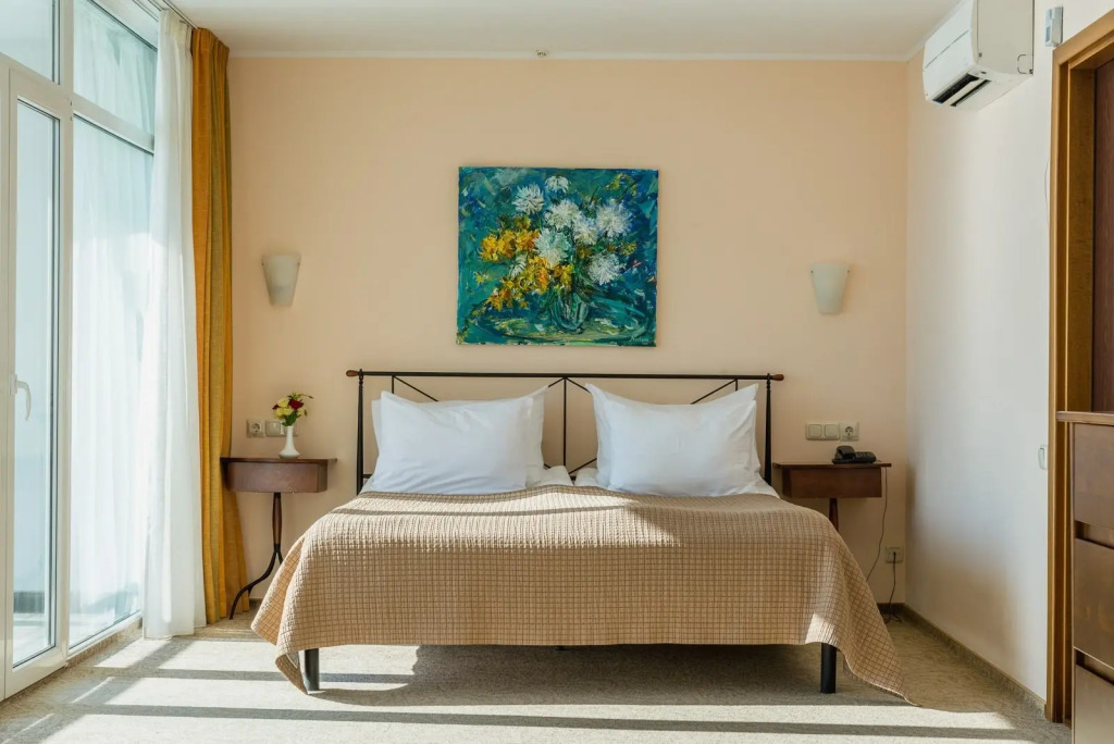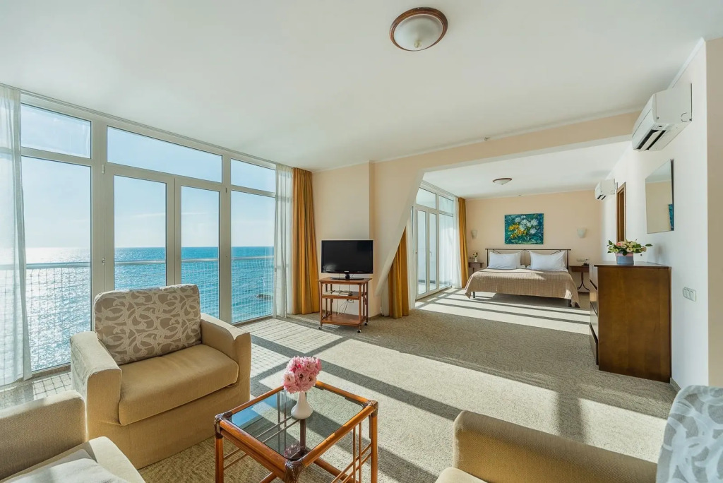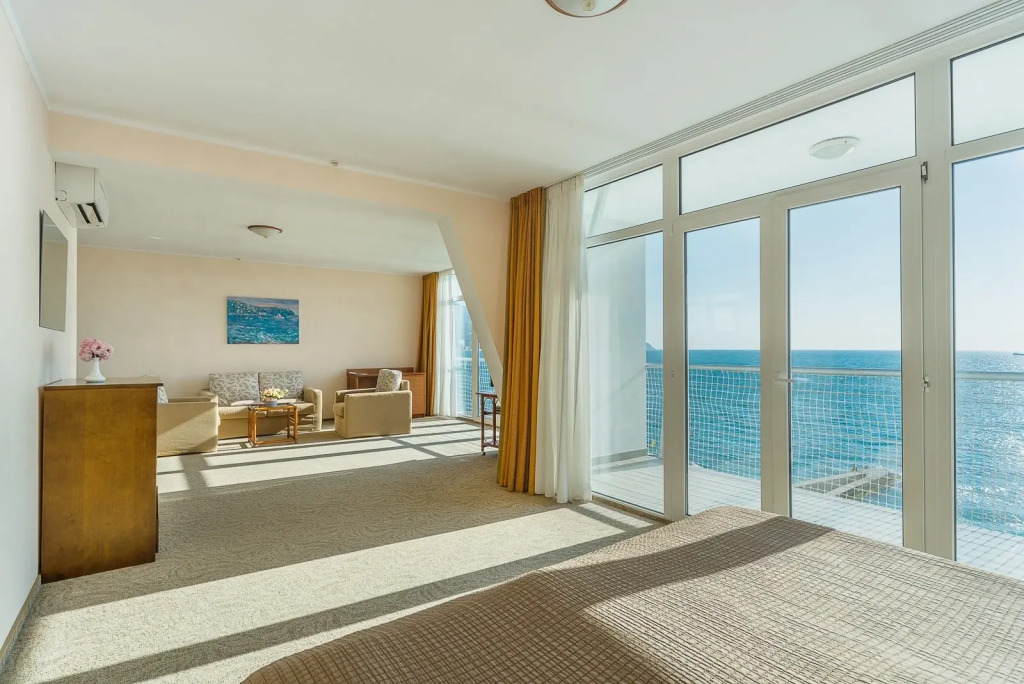 В номерах категорий «Двухместный номер Классический с балконом и с видом на море» и «Люкс с балконом и с видом на море» имеются балконы классического и французского типа. Тип балкона при бронировании данных номеров не гарантируется.