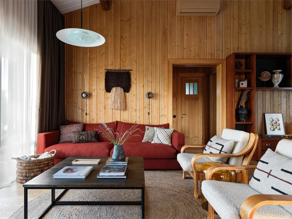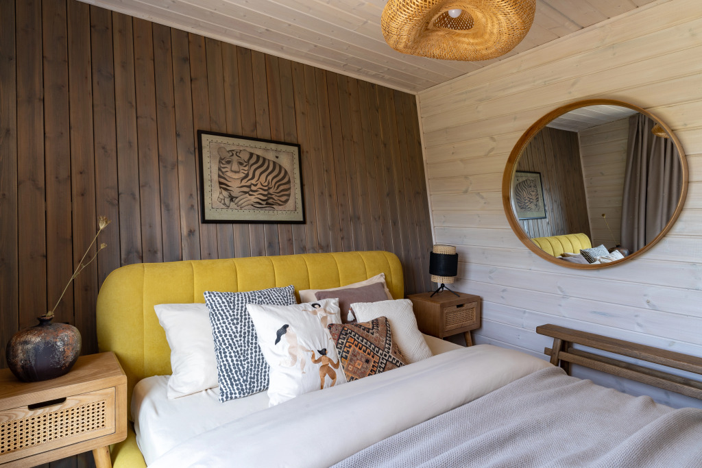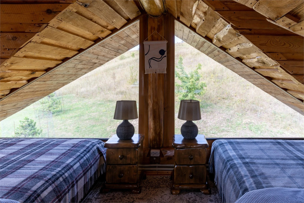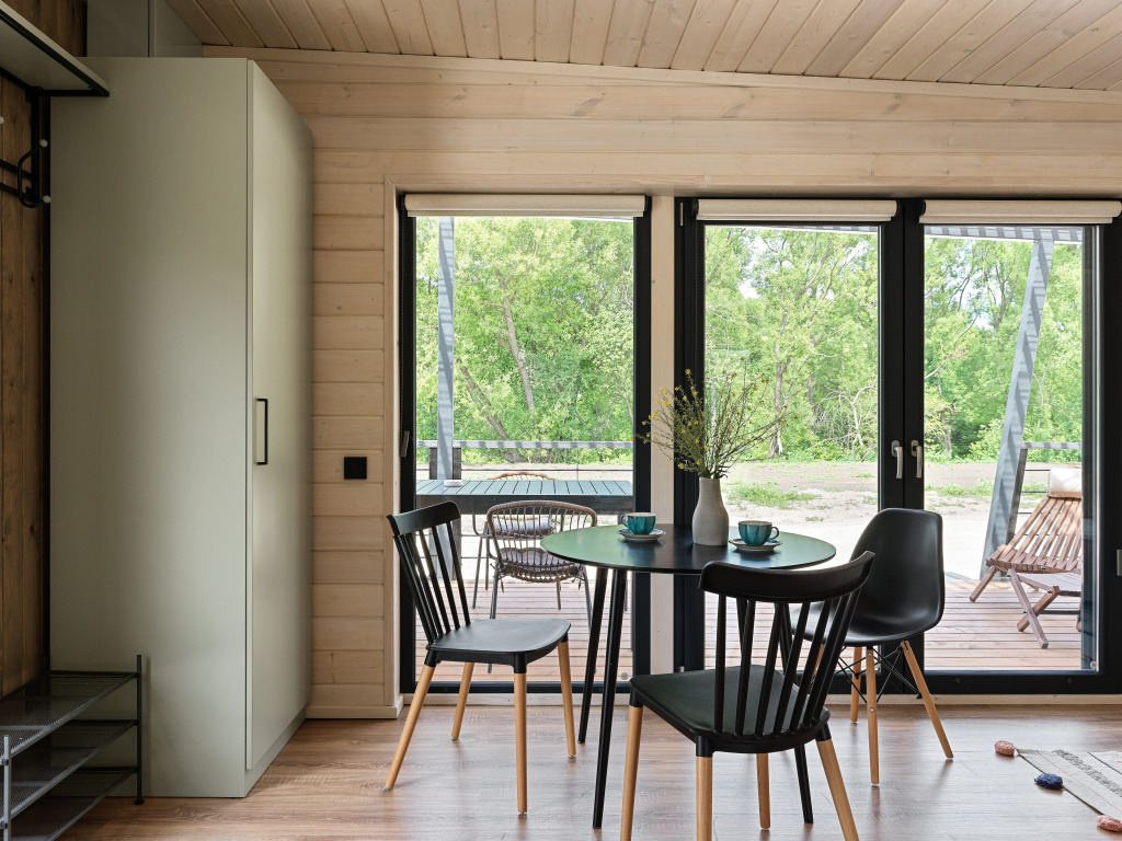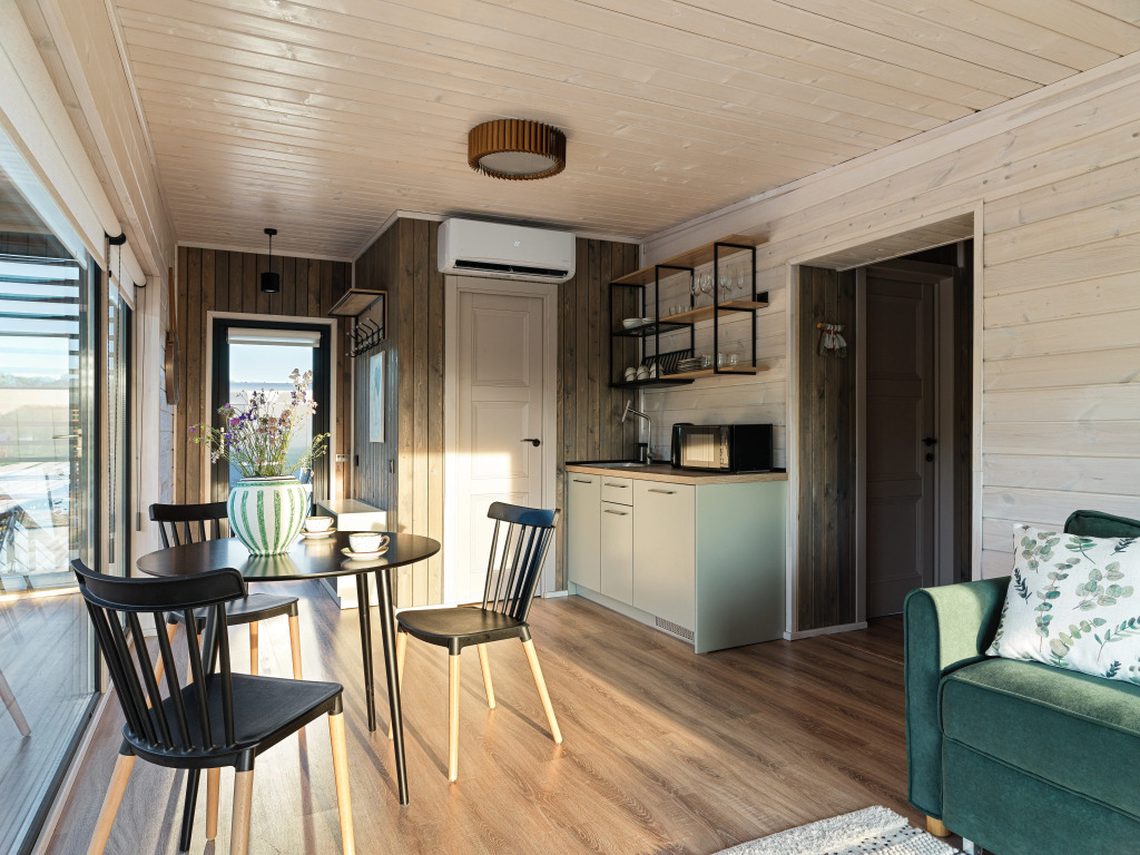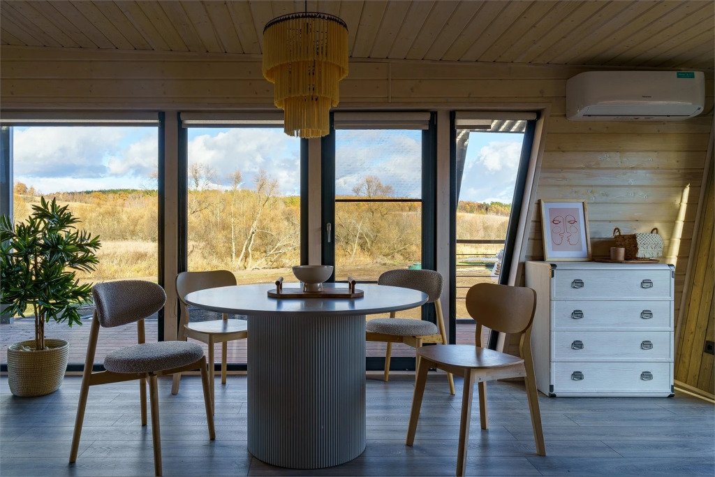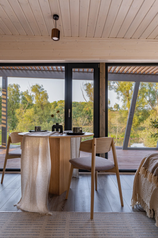 Проживание возможно в домах с мини-кухней, гостиной зоной, спальными местами и ванной комнатой. Предусмотрены панорамные окна. Wi-Fi и телевизор отсутствуют.
