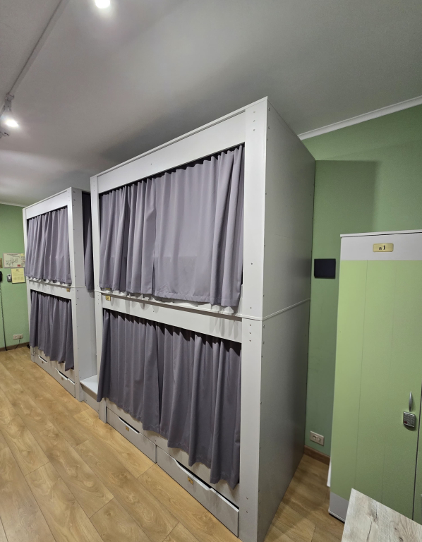 Удобная и приятная кровать, бельё было чистым и аккуратно застеленным — немного смутила дырка в наволочке, но ничего страшного (наверное). В общем и целом, приятный номер, разве что на фотографиях везде показаны лестницы в стандартном понимании, а в моём номере была лестница по которой надо было карабкаться, и это было весьма неудобно. Ничего ужасного, но ожидал «лесенки», хех. В самой, так скажем, капсуле, есть небольшая полочка, вешалка для двух вещей и розетка с лампой. Думаю капсула просторная — с моим высоким ростом (184 см) проблем не было. Есть камера хранения, которая по пинкоду открывается, удобно! Также в комнате находится стол и стулья, но в моём случае они почти все были заняты — впрочем, я не думаю, что за ними можно было бы с комфортом сидеть продолжительное время, например работая или читая книгу. Окна показались большими, не было шумно (кроме храпа соседей, но это само собой разумеющееся, хех).