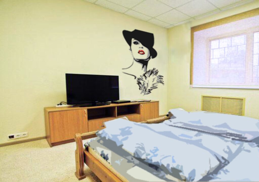 Кровать удобная, есть шкаф, тумбочки, телевизор, хорошее постельное бельё, хороший ремонт.