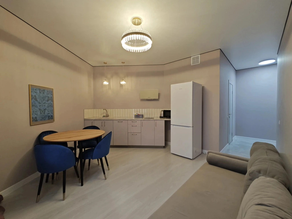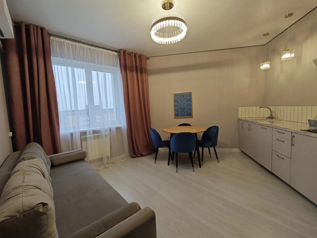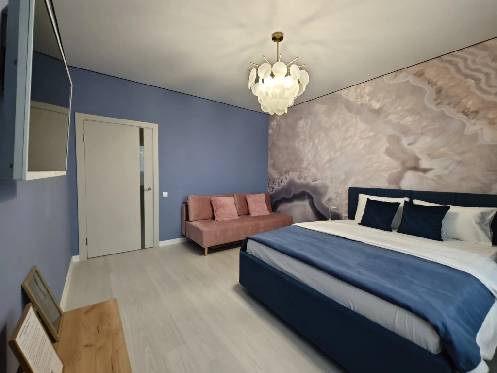 Квартира подходит для размещения до 5 гостей. В квартире отдельная спальня и кухня-гостиная, двуспальная кровать, два раскладных дивана. Есть лоджия. Каждому гостю предоставляется отдельное одеяло, комплект полотенец.