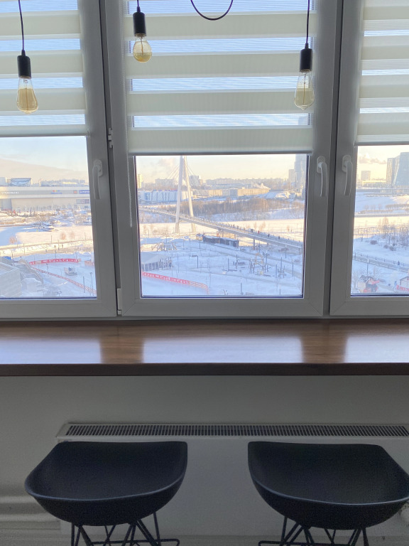Окна выходят на Москву-реку и храм. Апартаменты рассчитаны на размещение не более четырёх гостей. В наличии двуспальная кровать и раскладывающийся диван. Кухня оборудована техникой, посудой, капсульной кофемашиной. В апартаментах имеется Wi-Fi, смарт-ТВ, кондиционер, стиральная машина, утюг, фен. Предоставляются комплекты полотенец, постельное бельё, халаты, тапочки и косметические принадлежности.