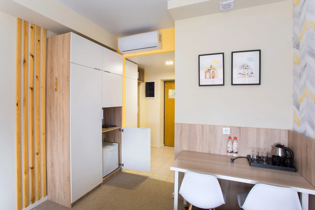 Много места для хранения. Есть тапочки, сейф, кондиционер, телевизор. При заезде в номере стоит две бутылочки с водой.