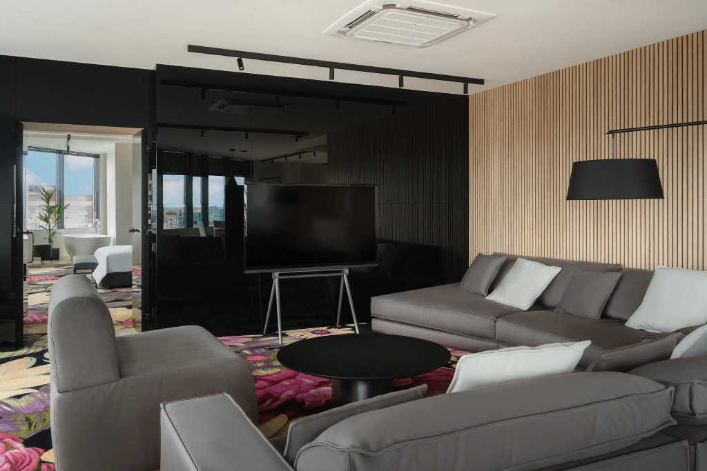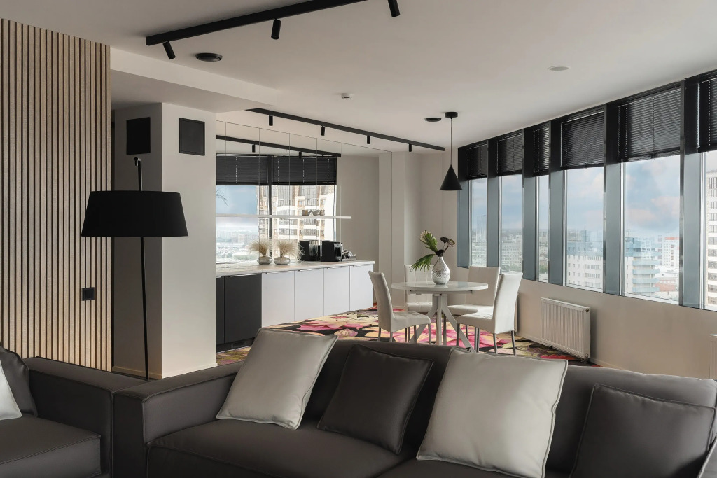 На 20-м этаже находится панорамный люкс «На 7-м небе» площадью 127 кв. м. Обзорные окна открывают виды на город, мосты и вечерние огни мегаполиса, также у панорамного окна находится ванна. В номере: кровать с одеялом и подушками, кофемашина, парогенератор, велюровые халаты, косметика, гостиная зона и отдельная гардеробная.