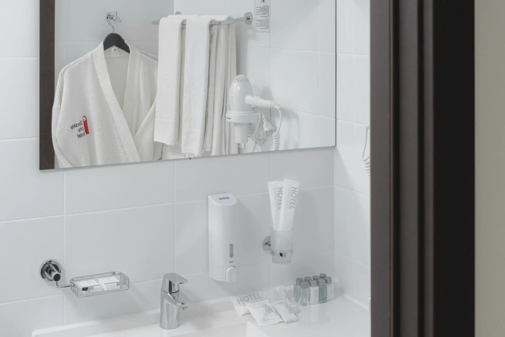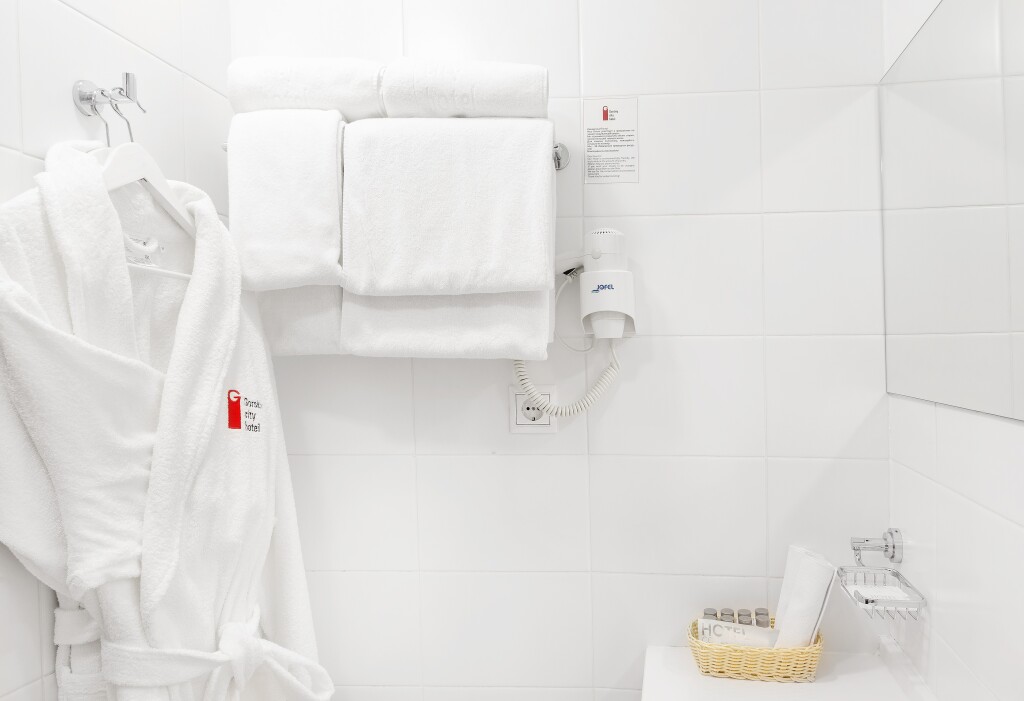 В ванной комнате — душевая кабина, санузел, фен, халаты, тапочки, туалетные принадлежности. Питьевая вода предоставляется ежедневно. Также для гостей есть номера с видом на реку Обь, расположенные на 18-20-х этажах.