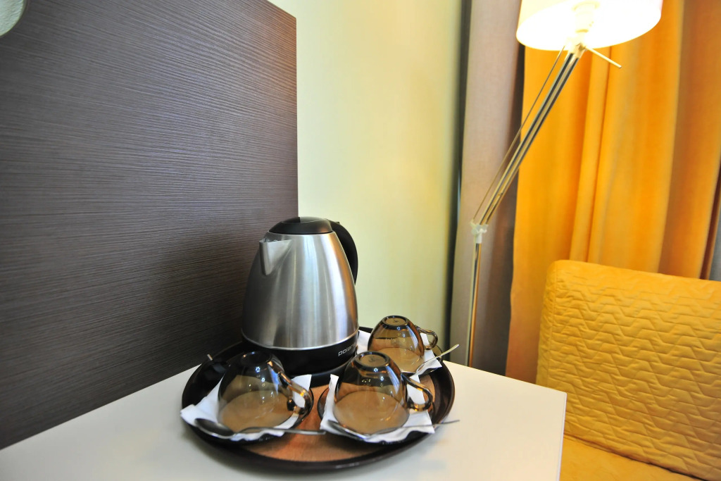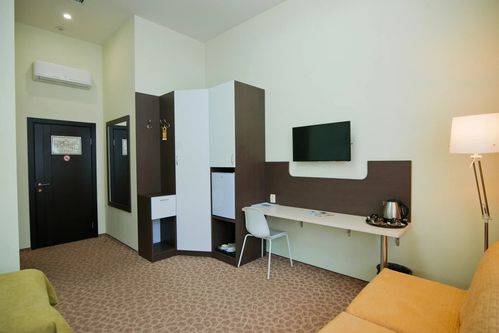 В каждом номере есть необходимое для пребывания и отдыха: эргономичная мебель, ортопедические матрасы, шторы блэкаут, кондиционер, телевизор с плоским экраном, холодильник, бесплатный Wi-Fi, принадлежности для душа, тапочки, фен.