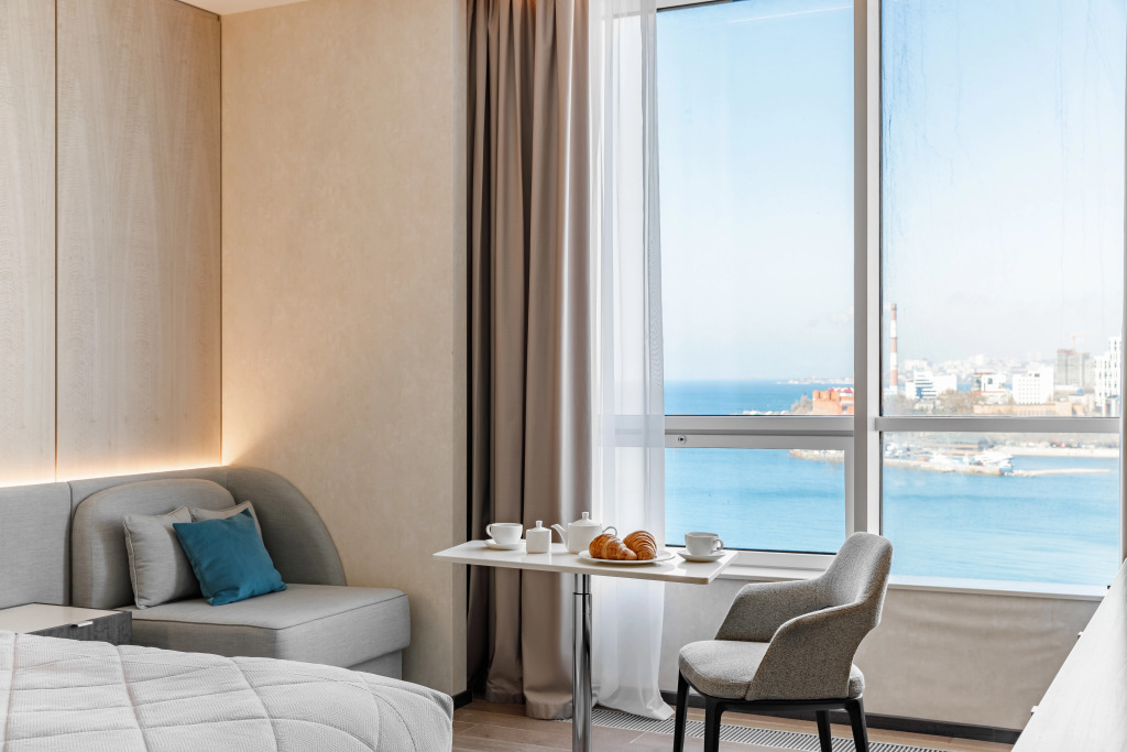 Из номеров открываются панорамные виды на акваторию Амурского залива. Апартаменты оборудованы необходимым для проживания, гостям доступна кухня. Номера располагают бытовой техникой (холодильник, духовой шкаф с функцией СВЧ, варочная панель, набор посуды, стирально-сушильная машина и гладильная станция, а также стайлер и фен).