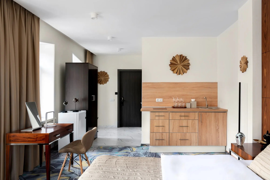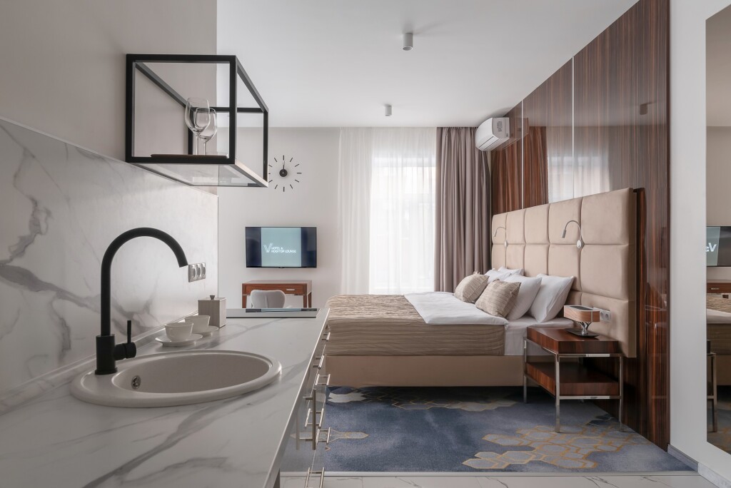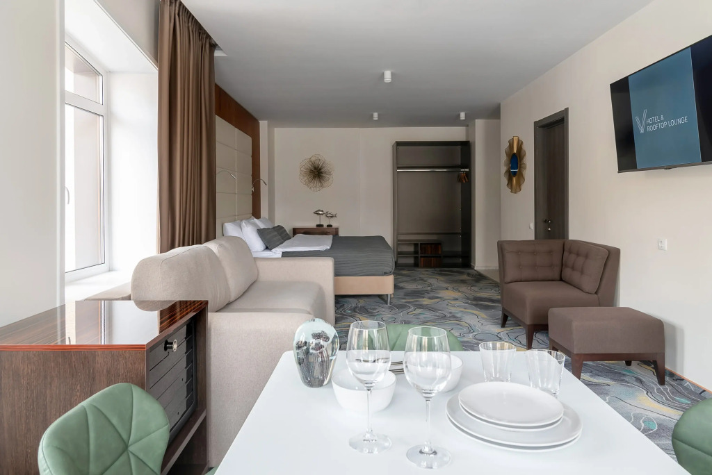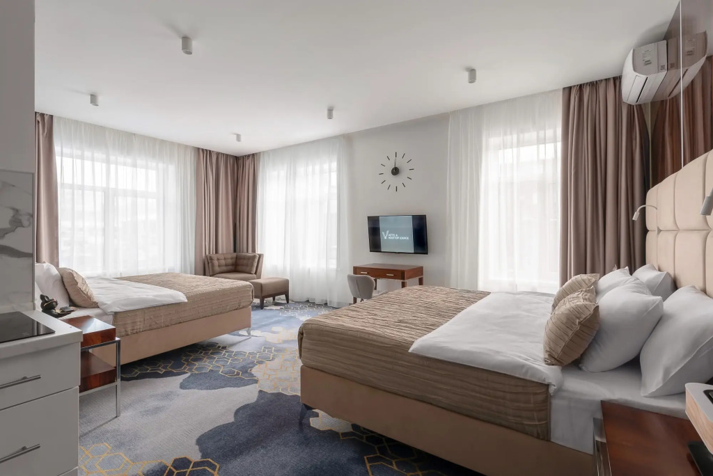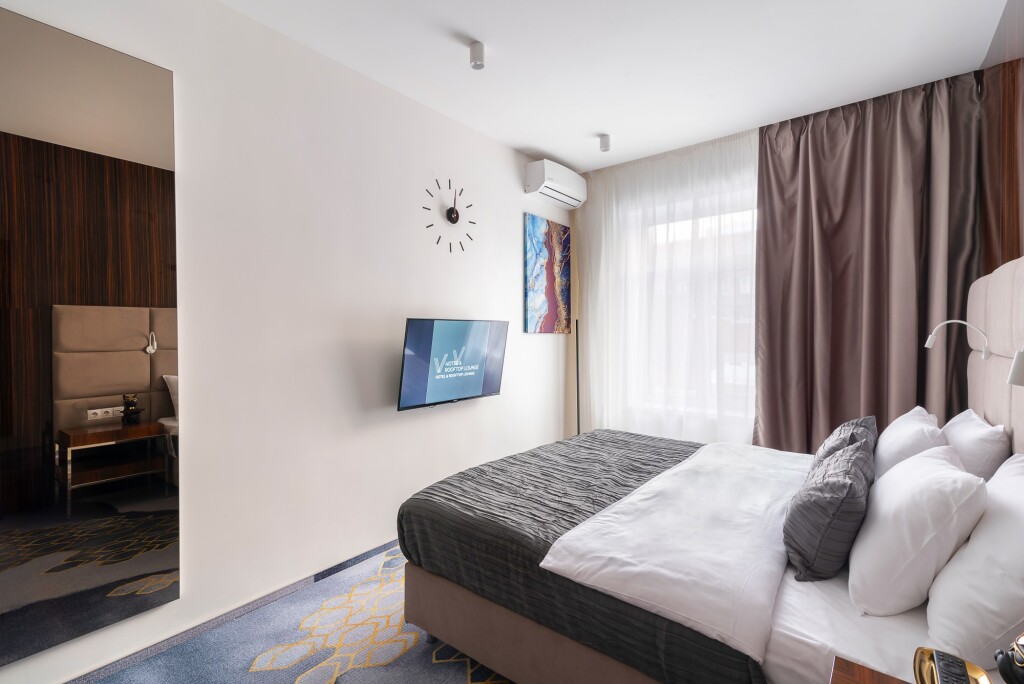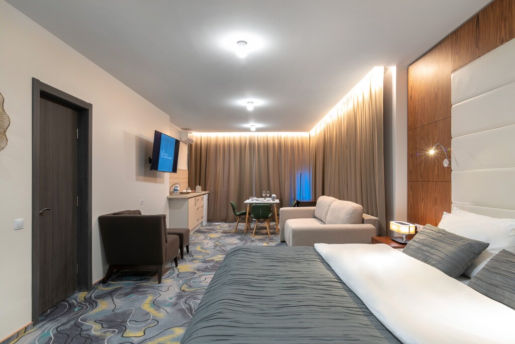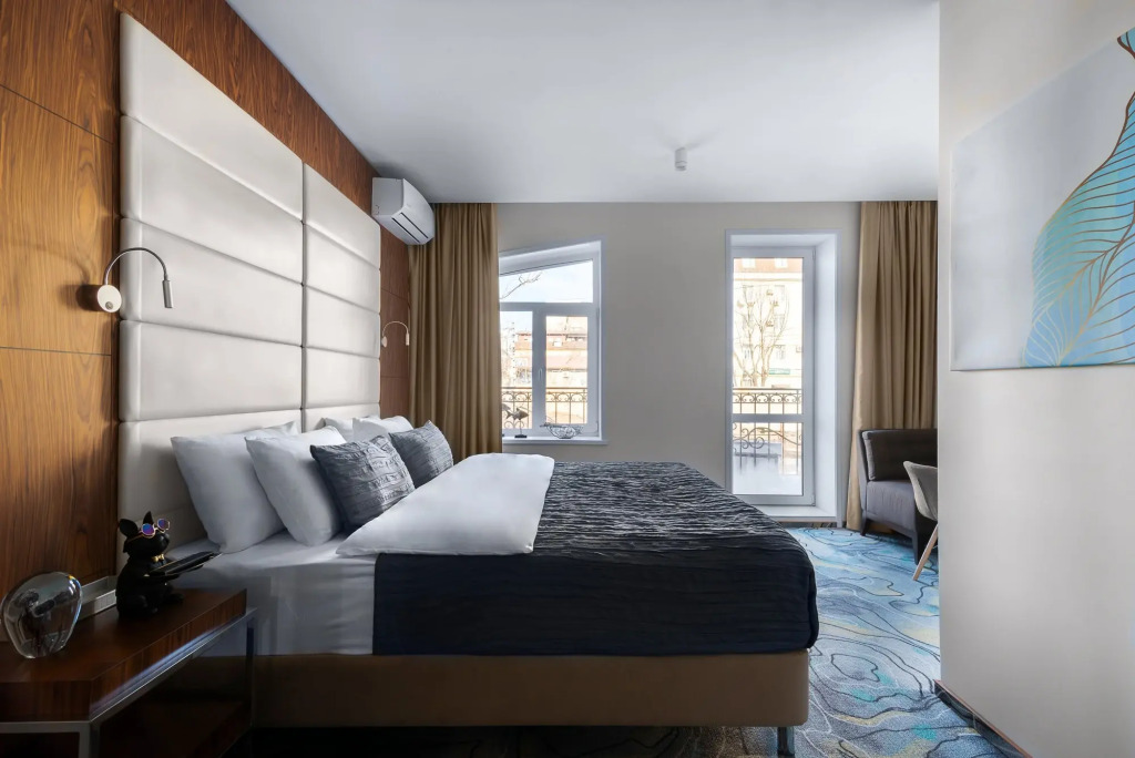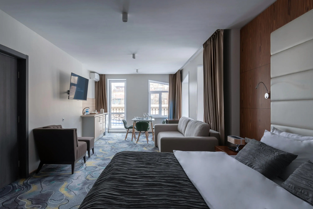 Каждый номер оборудован Smart TV, автоматическими шторами, кофемашинами, мини-барами, кондиционерами. Имеются номера с балконами и видом на центр города. Апартаменты оснащены кухнями. В ванных комнатах установлена система «тёплый пол» и душ биде.