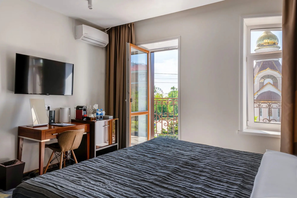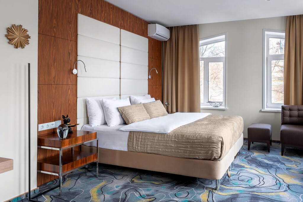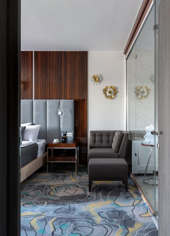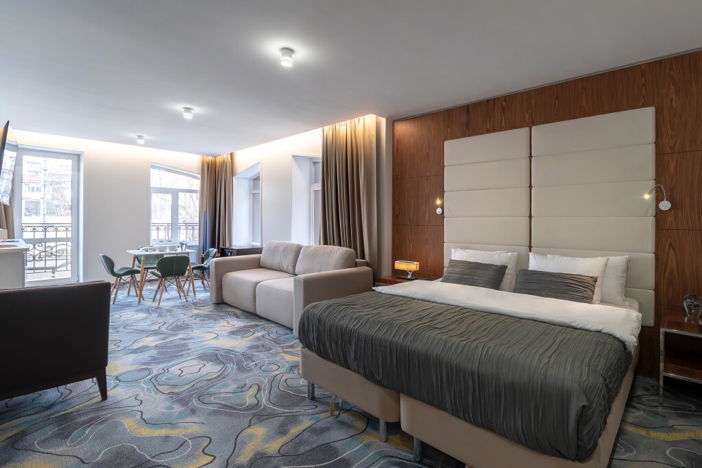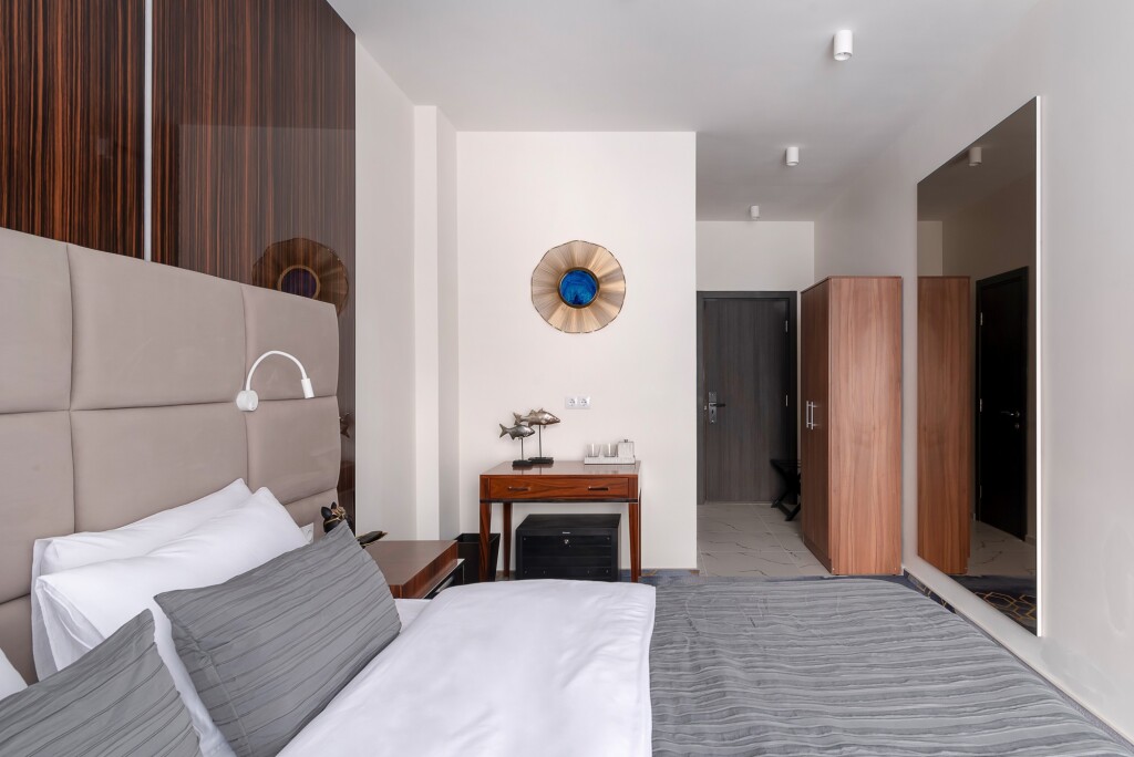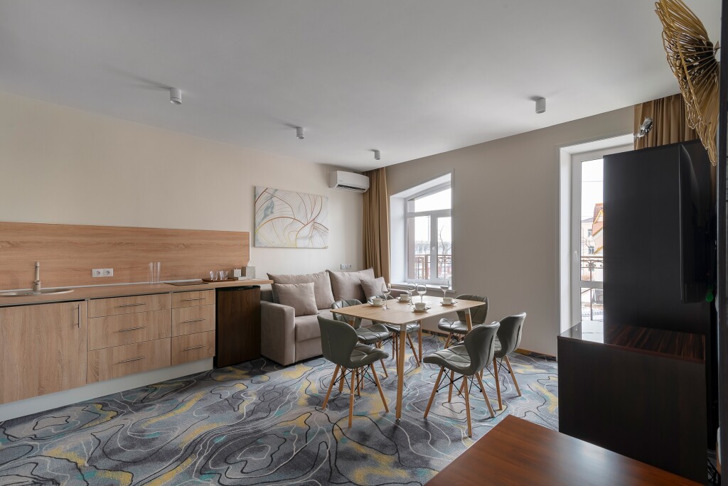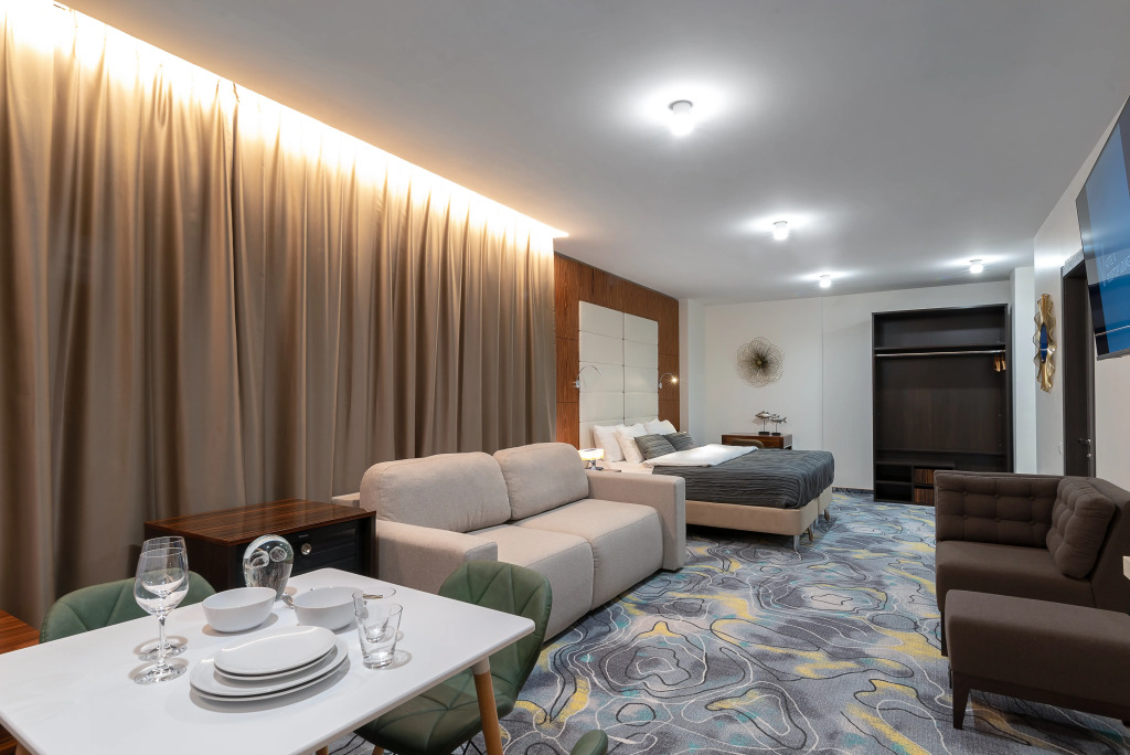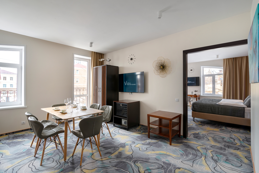 Каждый номер оборудован Smart TV, автоматическими шторами, кофемашинами, мини-барами, кондиционерами. Имеются номера с балконами и видом на центр города. Апартаменты оснащены кухнями. В ванных комнатах установлена система «тёплый пол» и душ биде.