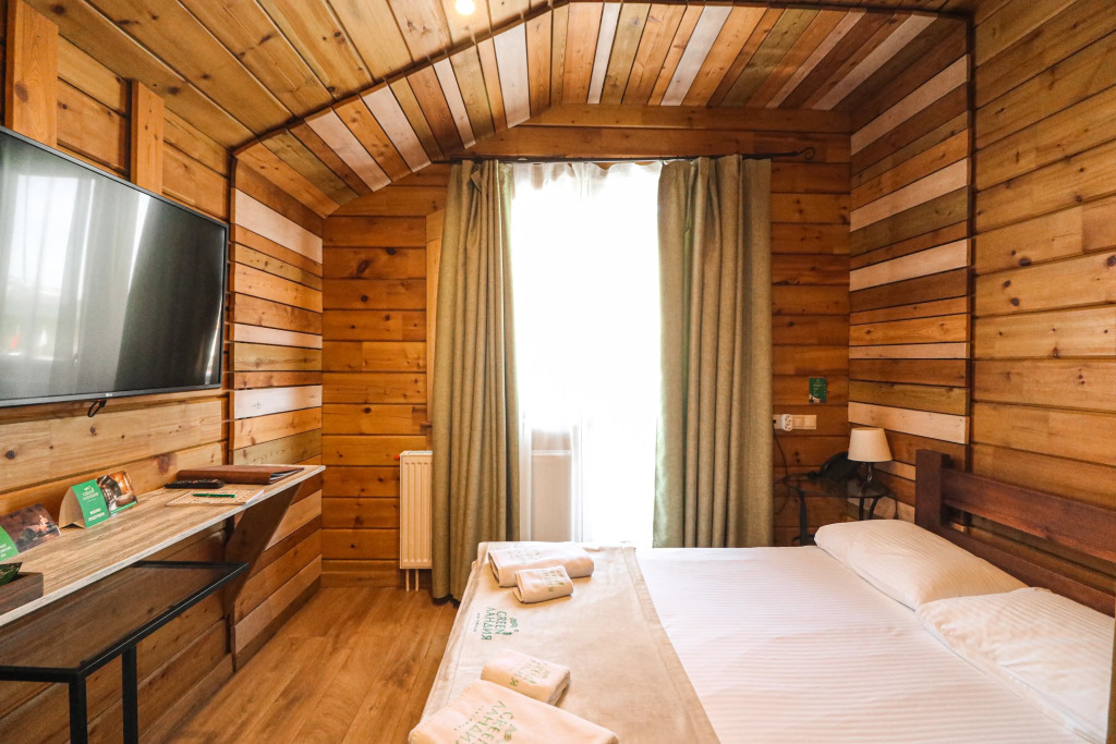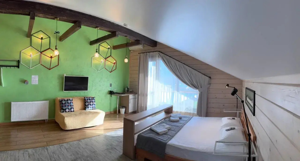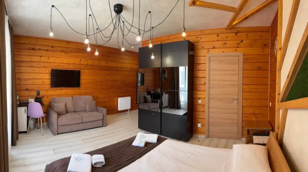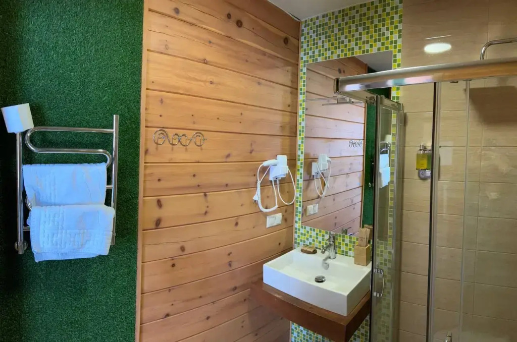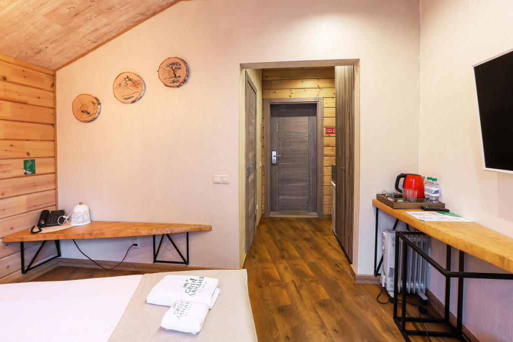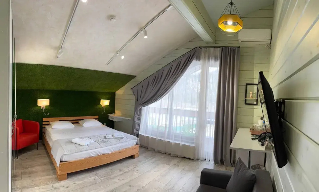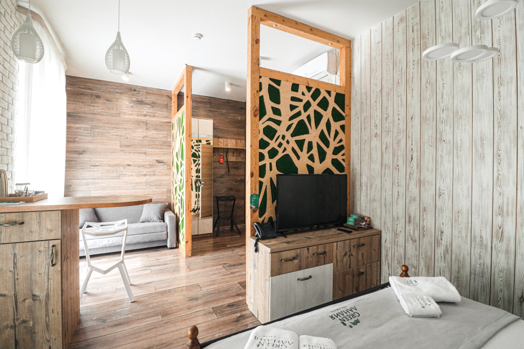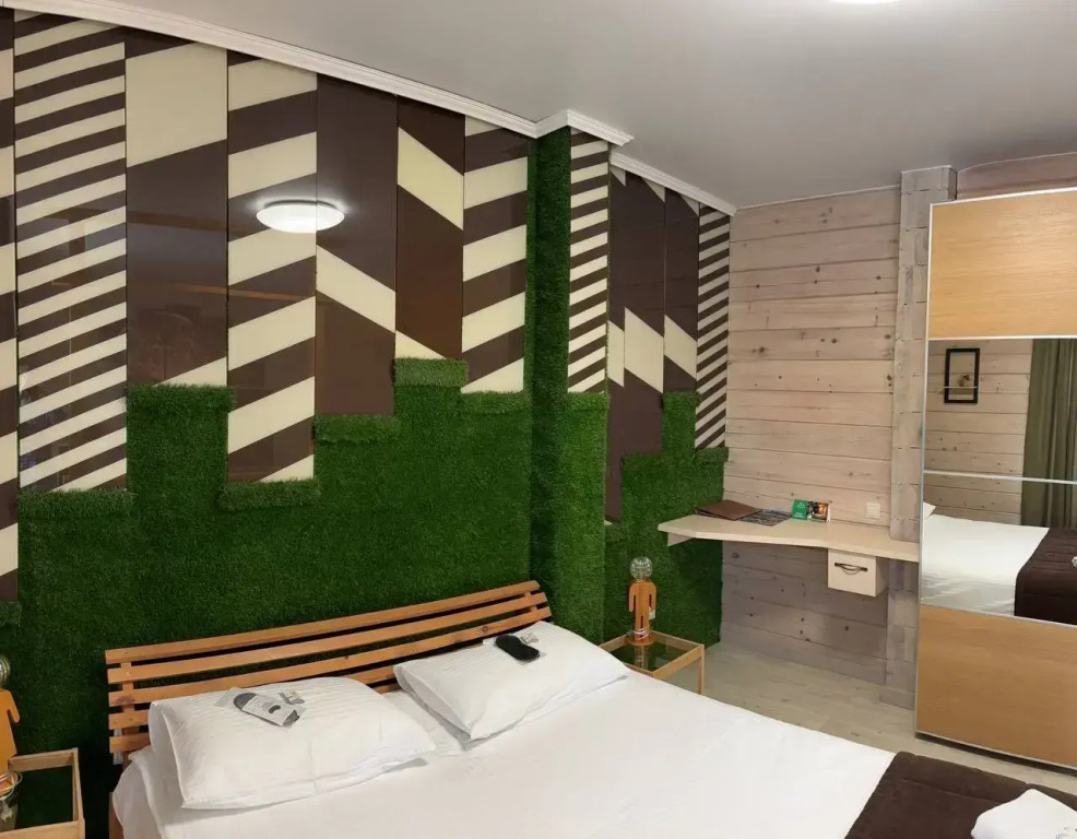 Отель «Green Ландия» расположен в городе Манжерок. Отель находится вблизи реки Катунь, в 7 км есть горнолыжные склоны.