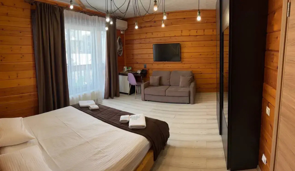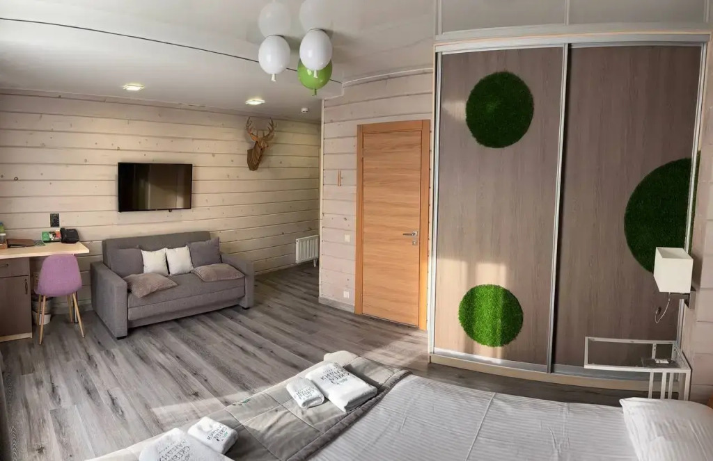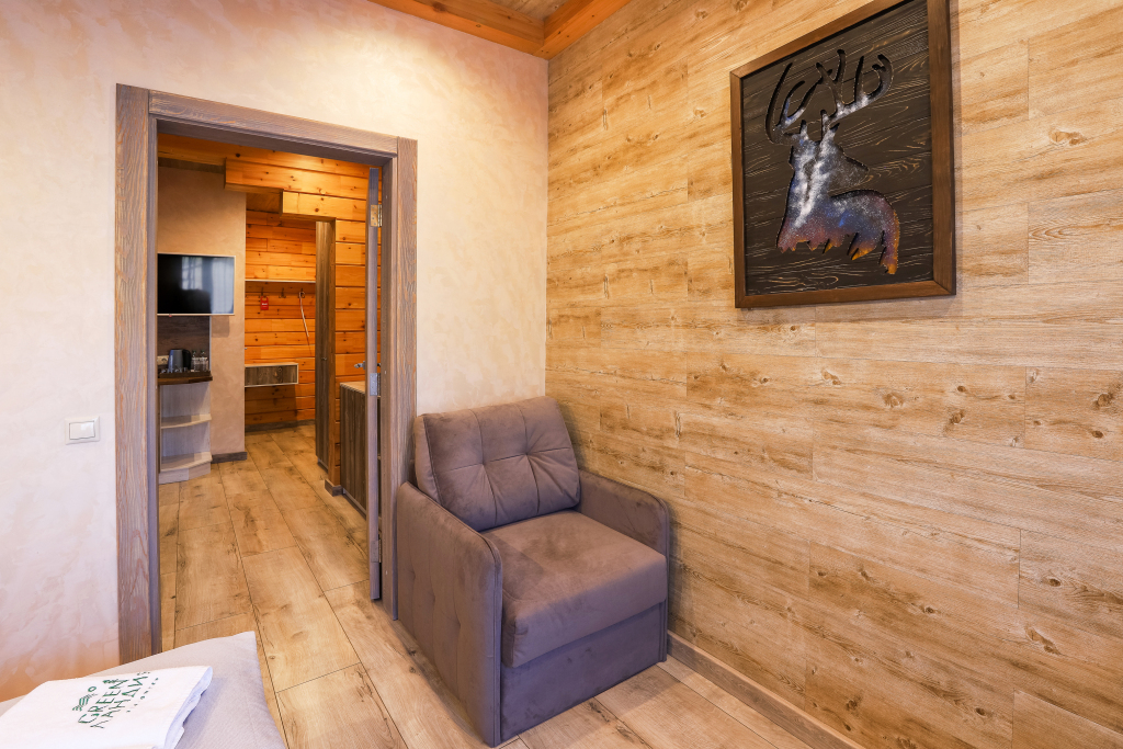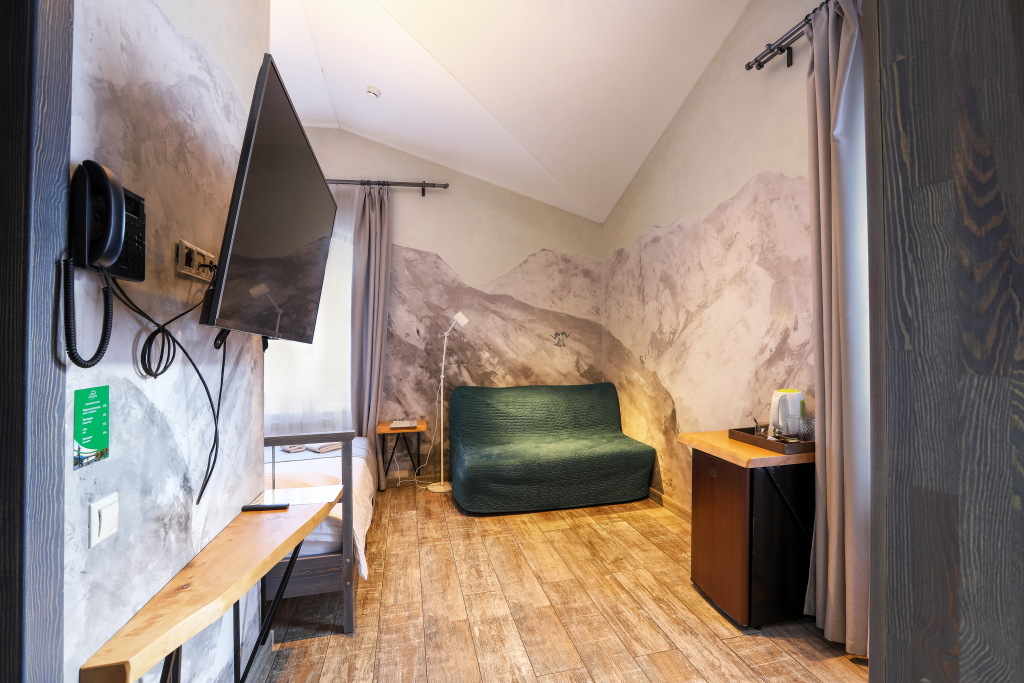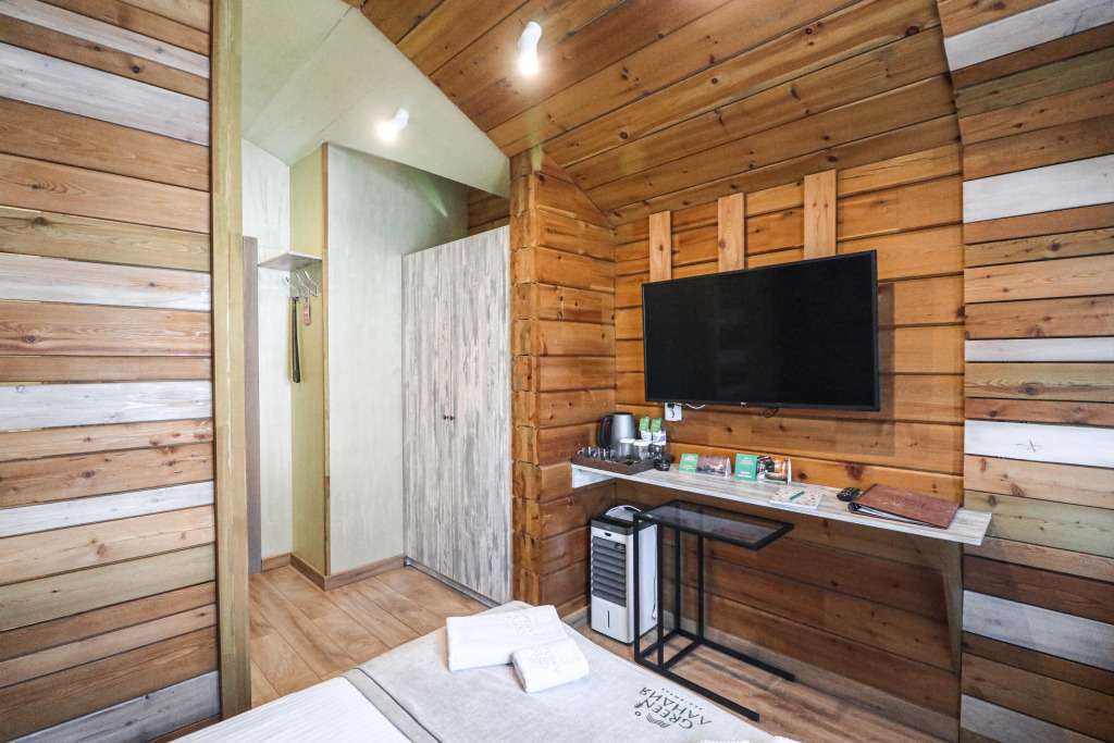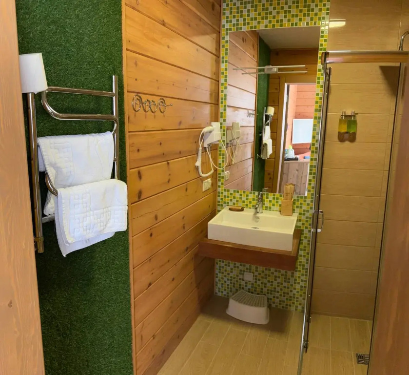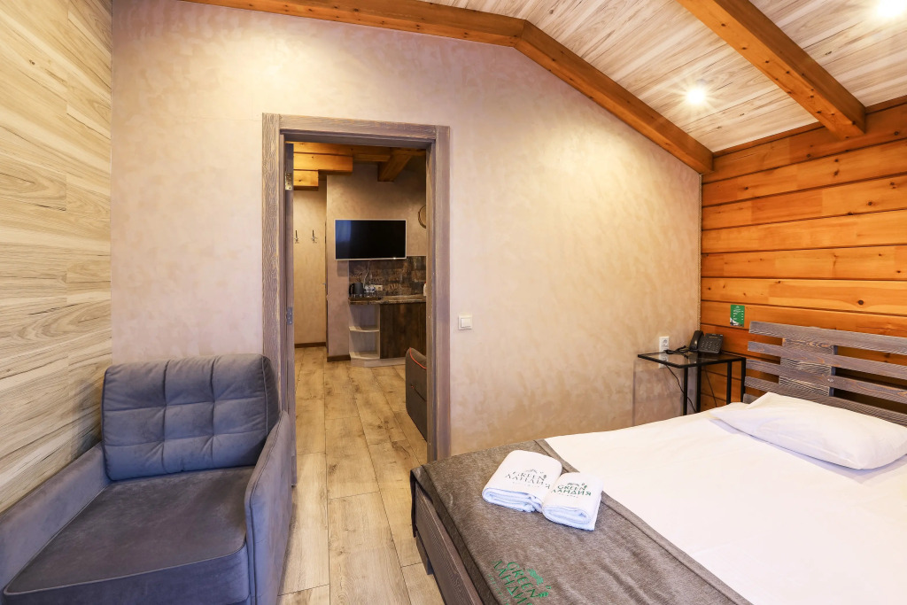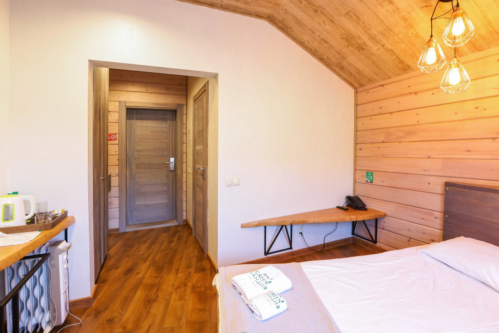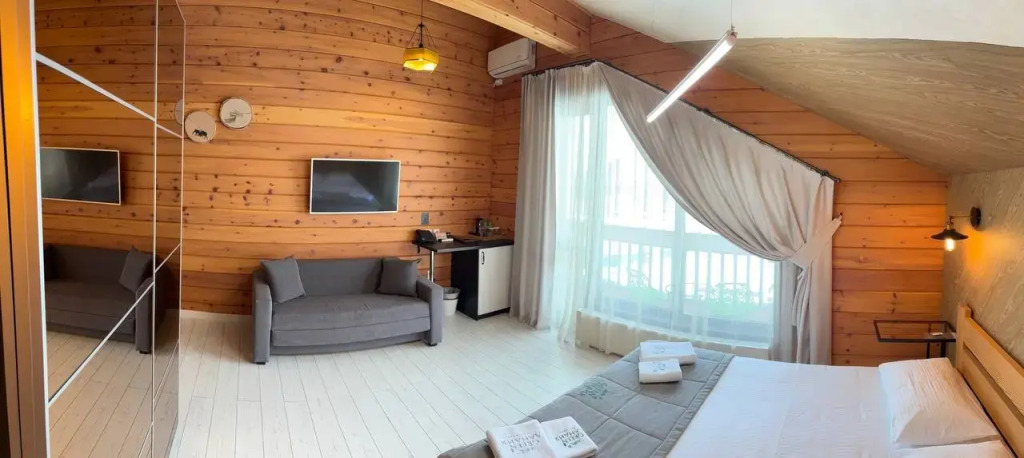 Отель «Green Ландия» расположен в городе Манжерок. Отель находится вблизи реки Катунь, в 7 км есть горнолыжные склоны.