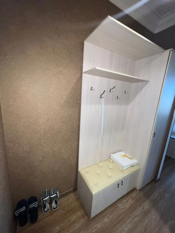 В номере есть небольшой коридор в котором стоит большой шкаф,куда можно развешать всю одежду,есть обычные вешалки для того что бы помешать куртку,ложка и пуфик для удобства.