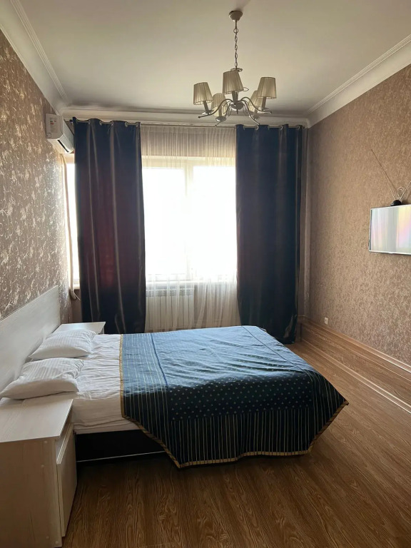 Комната где находится кровать очень большая,не будете вспотыкаться о мебель(к слову о мебели,большая двухспальная кровать,две прикроватные тумбы,столик,телевизор и кондиционер)