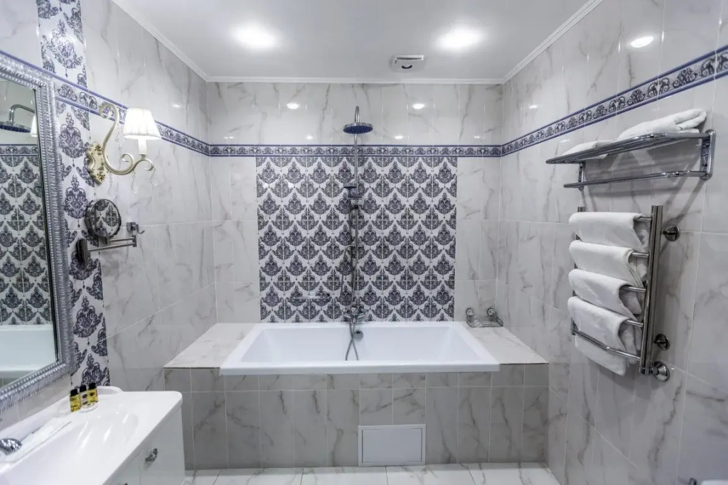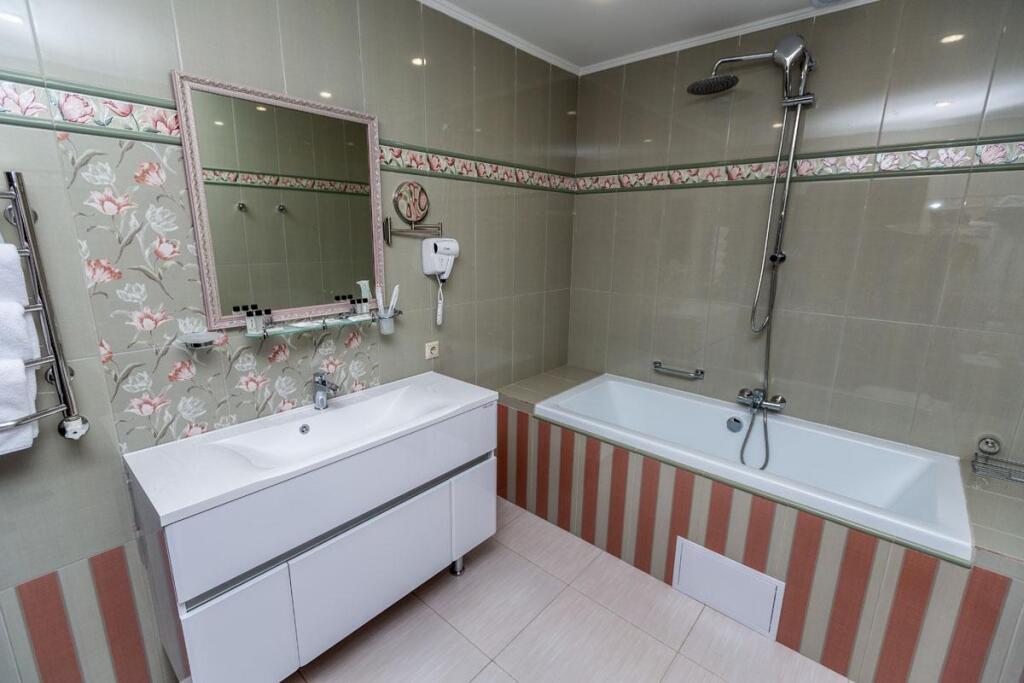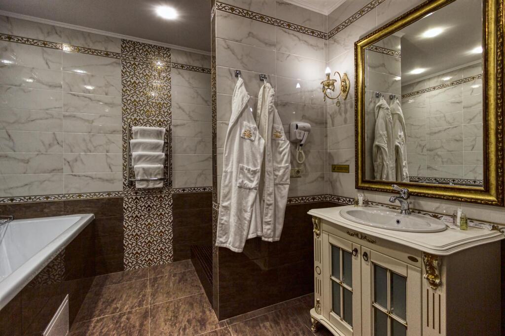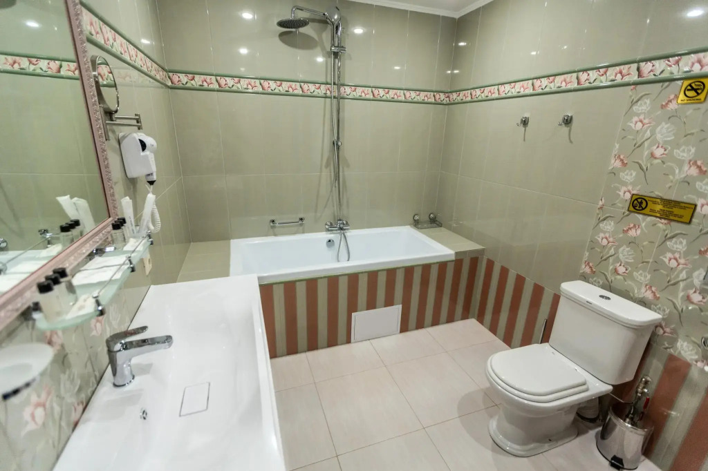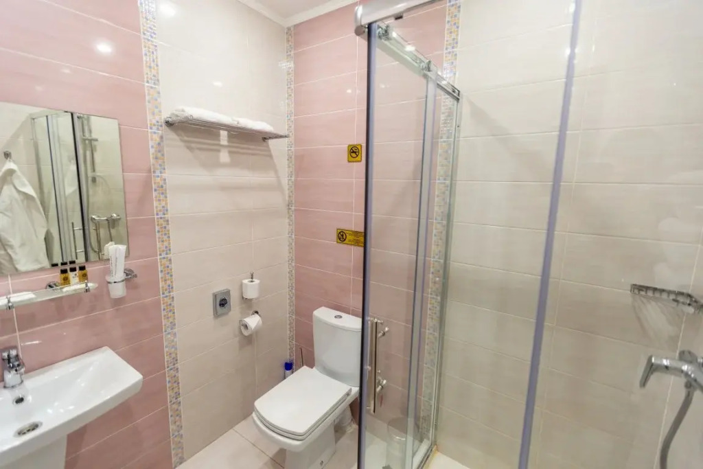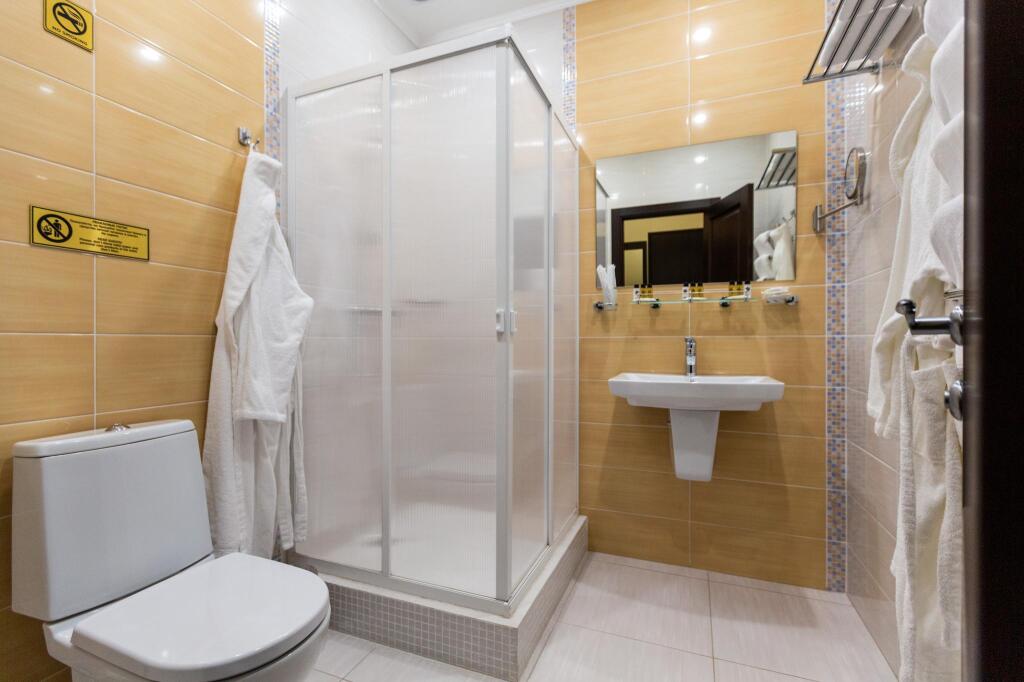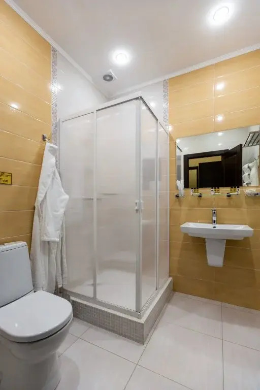 В номере вы найдёте душ, халат и тапочки. Оснащение зависит от выбранной категории номера.