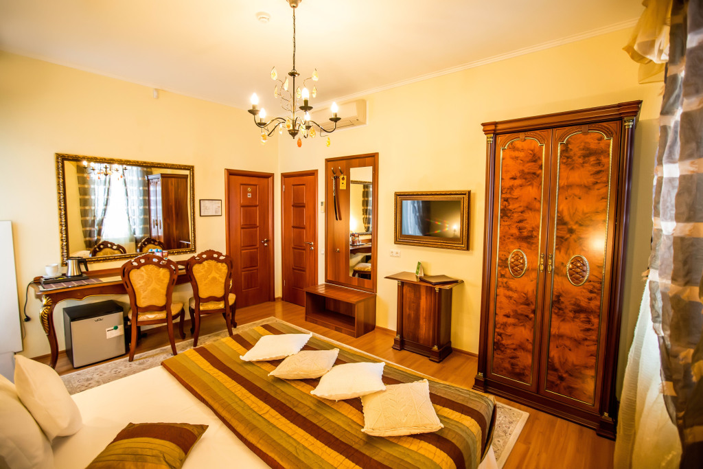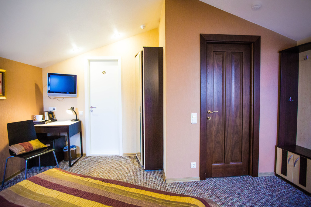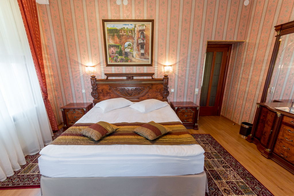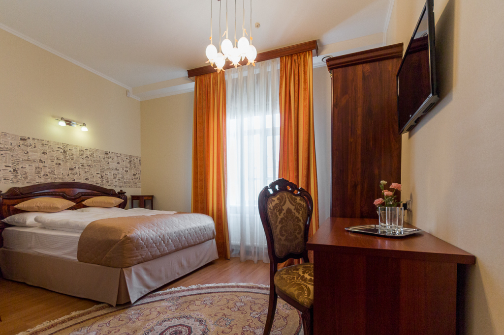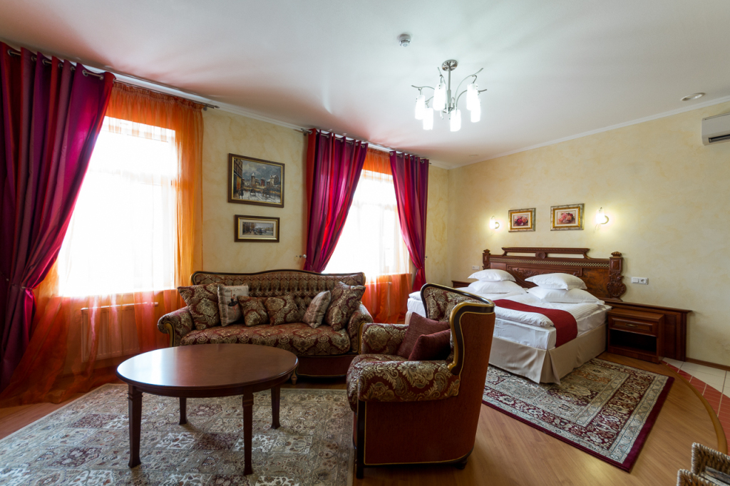 Номер у нас был улучшенный, на 2 этаже, очень большой, угловой, с окнами на 2 стороны. При заезде предупредили, что работает одна из двух батарей, может быть прохладно. Но на улице в это время была плюсовая температура, прохлады мы не заметили, зато номер очень красивый, с огромной кроватью, с огромным санузлом, в котором был подогреваемый пол. Место расположение очень тихое, в то же время 10-15 минут пешком до центральной улицы Ленина со множеством магазинчиков, ресторанов, и до набережной.