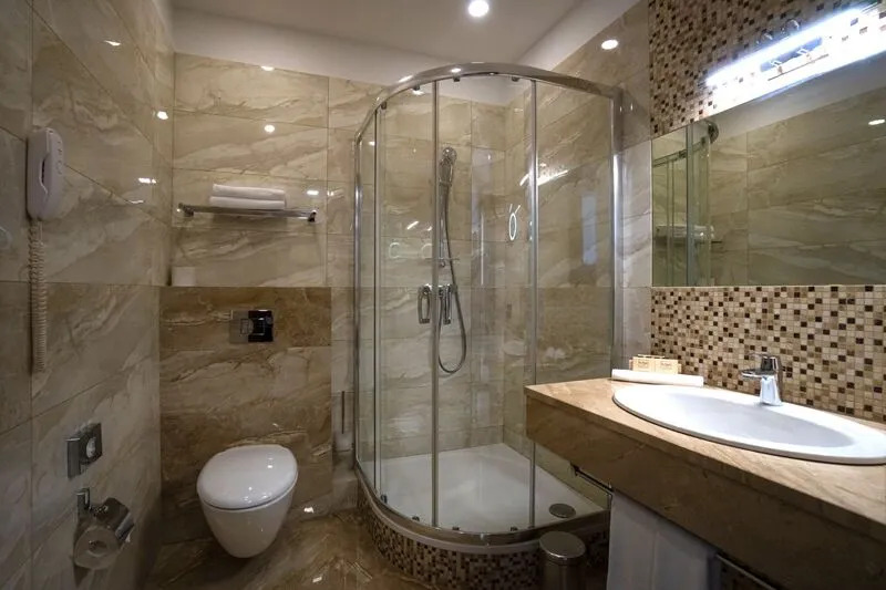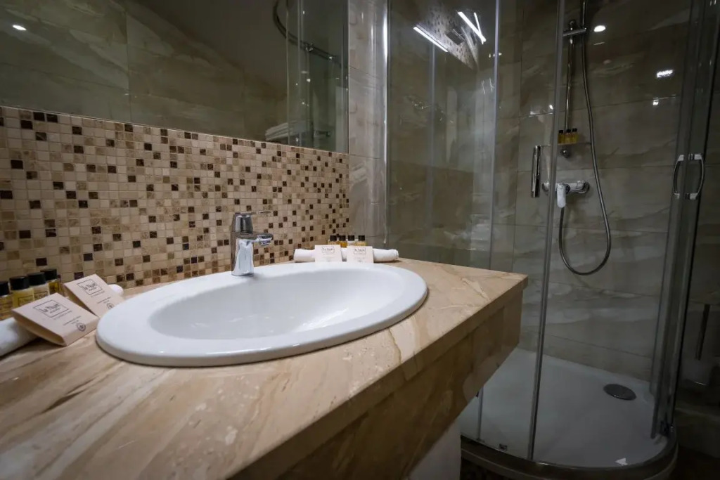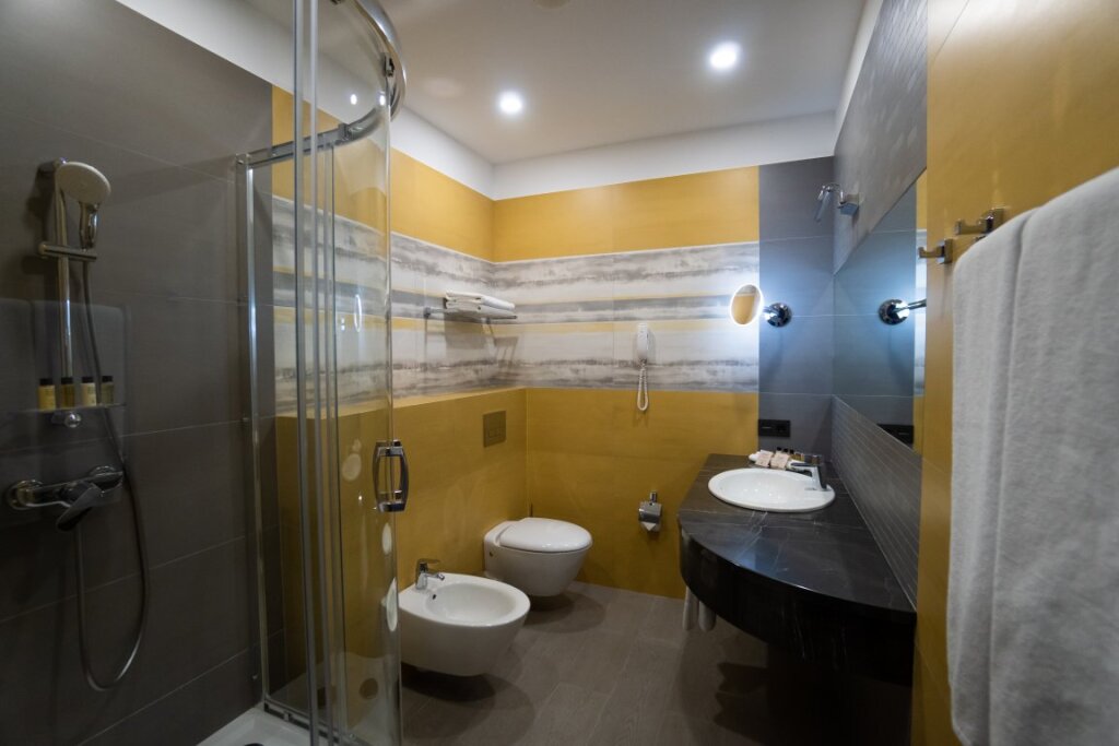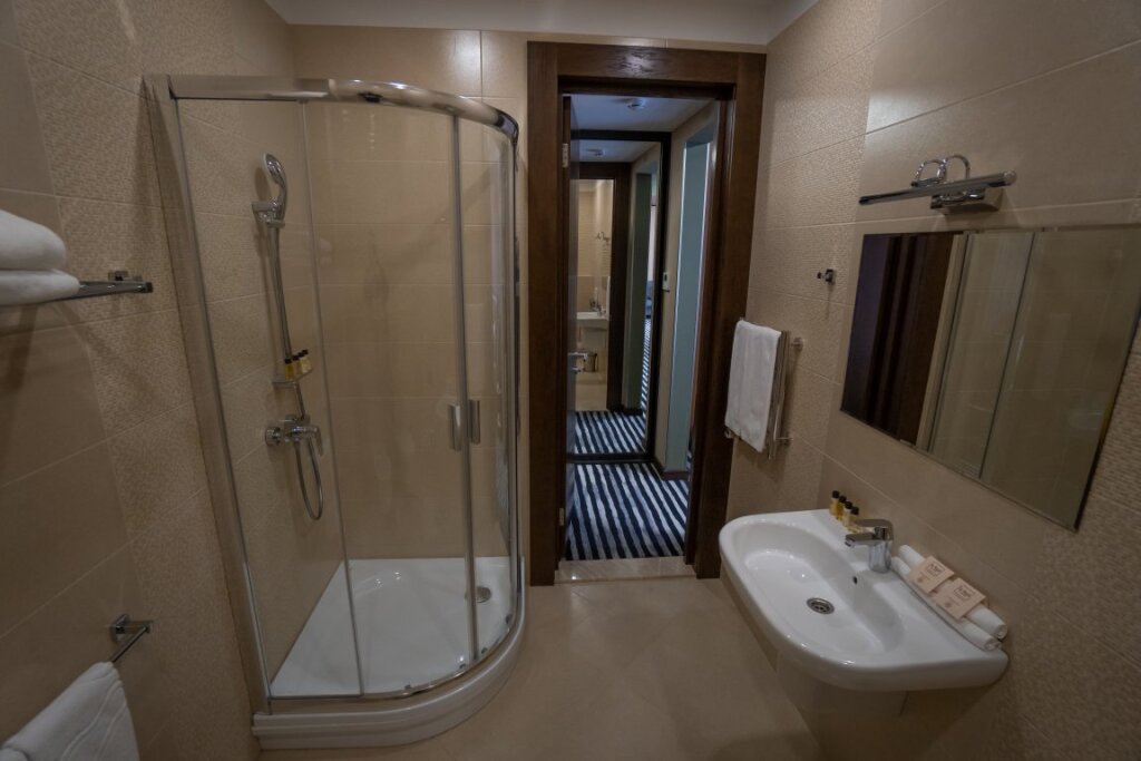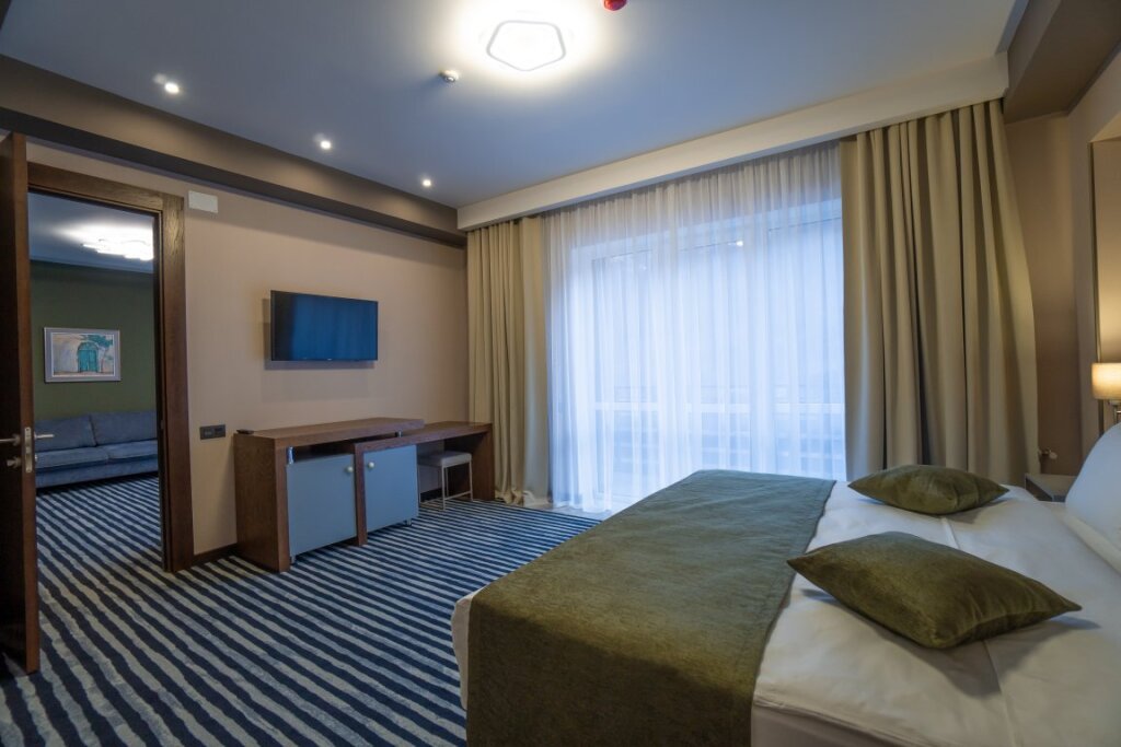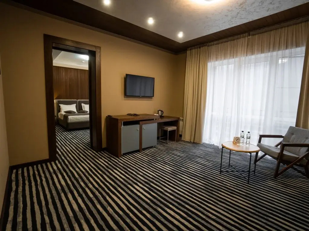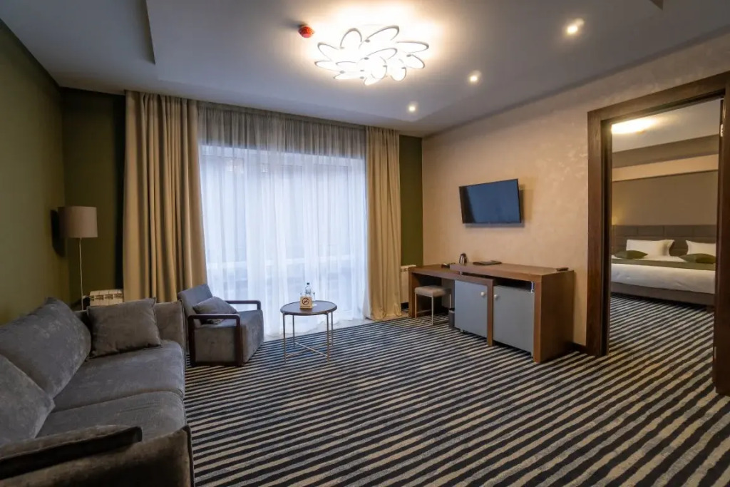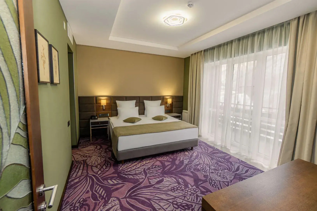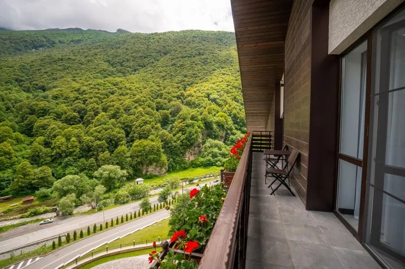 Просторный чистый номер с французким балконом, у нас был вид на ущелье, у детей на гору и лес. Фен, утюг, туалетные принадлежности, чайник.
