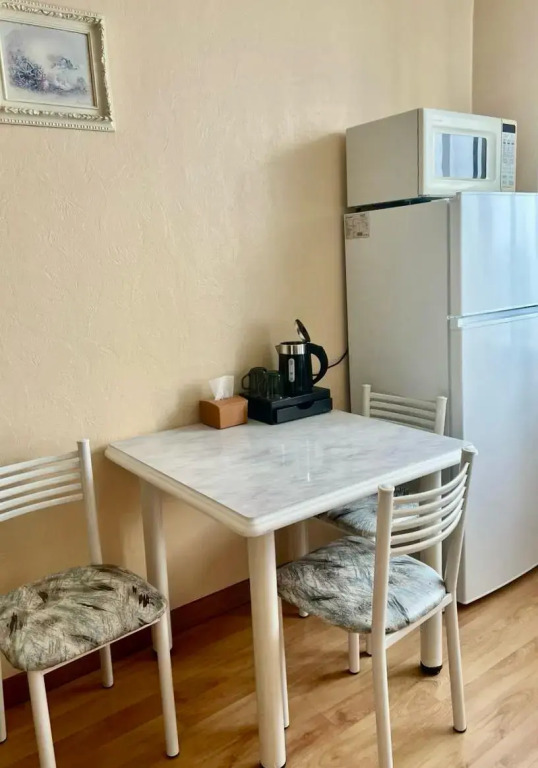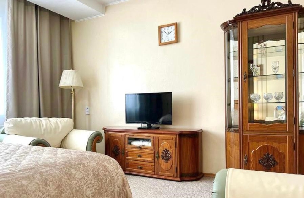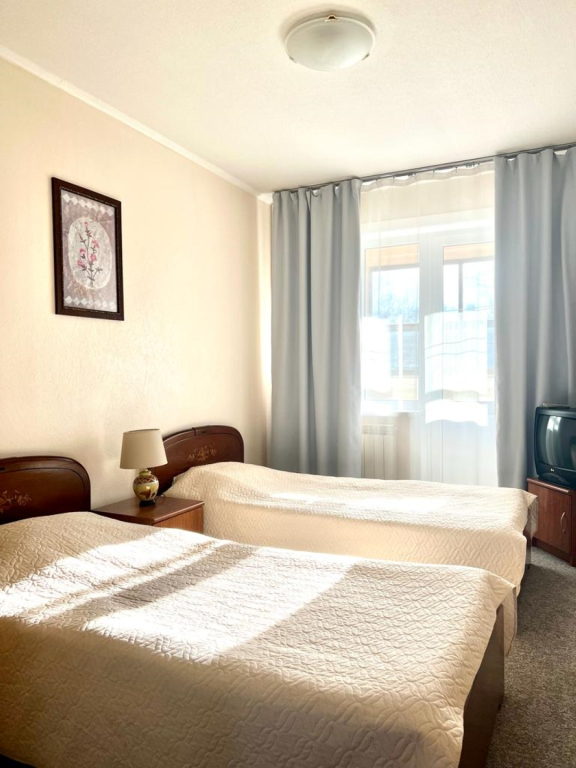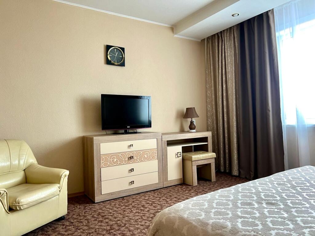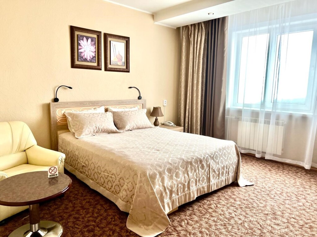 Двухместный номер стандарт во всем устроил, было все, что нужно для комфортного проживания, находясь в командировке. Отдельная кухня, на которой можно что-то приготовить, ни разу не воспользовалась возможностью, холодильник, свч, обеденная зона. Раздельные ванна, туалет. Комната светлая, двухсп. кровать, тв, кресла, журн.столик, на полу ковролин.