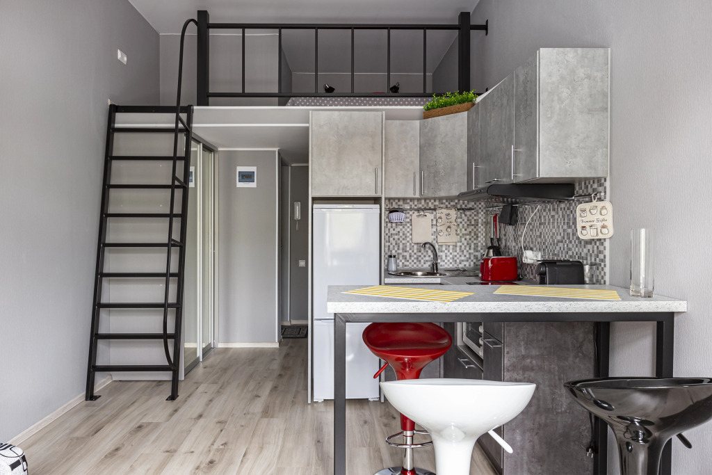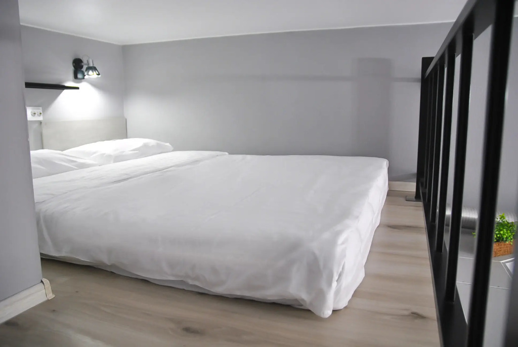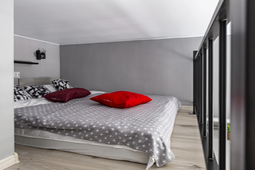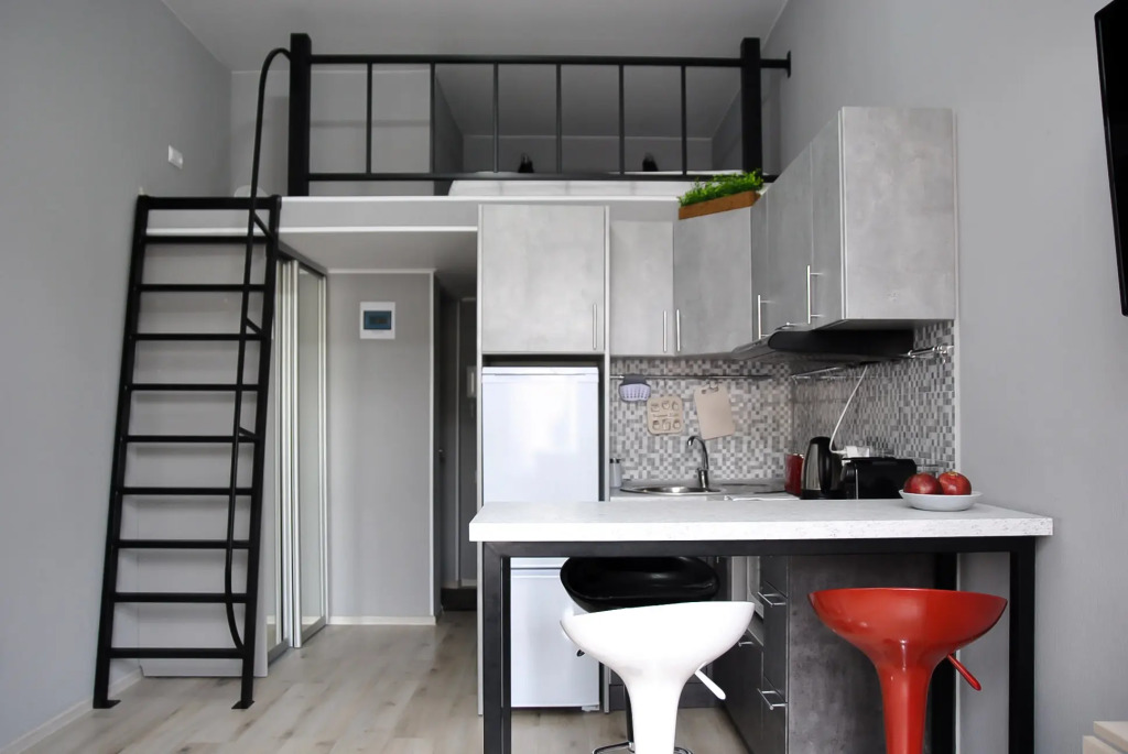 Хороший номер, на первом этаже диван, на втором двухспальная кровать. Полностью со всеми удобствами, фен, утюг, стиральная машина, плита, чайник, духовка и даже тостер)) всё отлично. Было убрано, постельное и полотенца в комплекте. Из минусов только если придираться к низкому потолку на втором этаже, в полный рост не встанешь, но сидеть можно, для сна более чем достаточно! Чуть крутовата лестница, но это на фоне остальных плюсов сущии мелочи!! Очень понравилось, тихо, чисто, аккуратно, кодовые замки, всё супер!