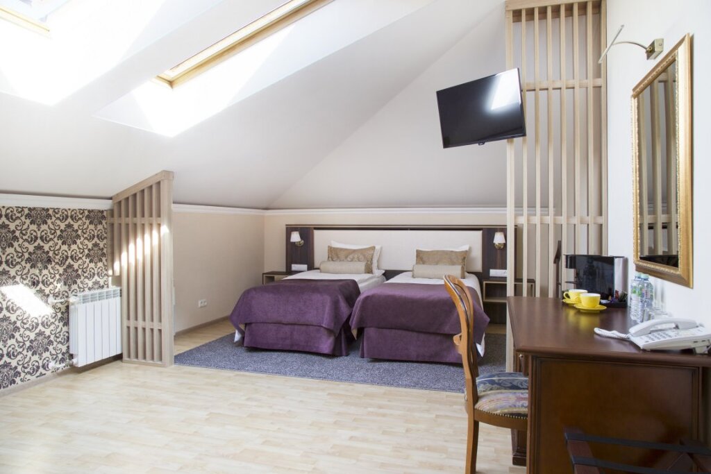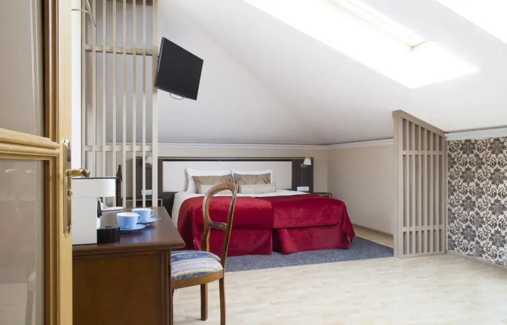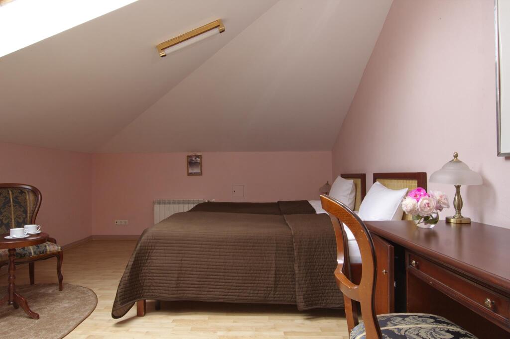 Гостиничный комплекс представляет собой двухэтажный особняк. Внутреннее убранство отеля выполнено в едином классическом стиле. При входе в отель расположен холл, из которого открывается вид на парадную лестницу, ведущую на второй и третий этажи отеля, где расположены 4 номера категории «люкс» и 8 мансардных номеров, также выполненных в классическом стиле и оборудованных всем необходимым.