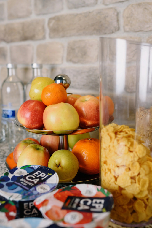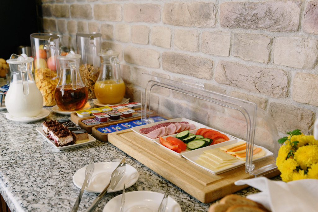Еда очень вкусная и сытная. На завтрак повара к вашему приходу готовят по 4 блюда: каши на выбор; на выбор яичница (омлет, глазунья или яйцо пашот) с помидорами, беконом; паста (фрикадельки, рыбные котлеты) с гарниром на выбор; запеканка (блины, оладьи) со сметаной, сгущенкой, джемом на выбор. В свободном доступе кофемашина, чай, вода, соки, фрукты, выпечка, нарезка - овощи, сыр, ветчина, сырокопченая колбаса.