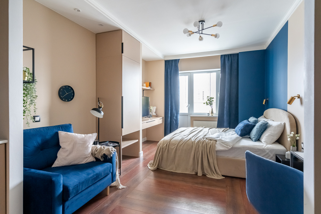 В распоряжении гостей есть большой распашной шкаф на входе с плечиками, санузел с ванной, кухонный уголок с индукционной варочной панелью, микроволновая печь, мини-холодильник, стиральная машина, посуда для приготовления и приема пищи, обеденная зона со столом и стульями, кресло-кровать, стол для работы за ноутбуком, большой телевизор, широкая кровать, балкон с барной стойкой-подоконником и барными стульями, фен, утюг, средства личной гигиены. А так же кофемашина Nesspresso.