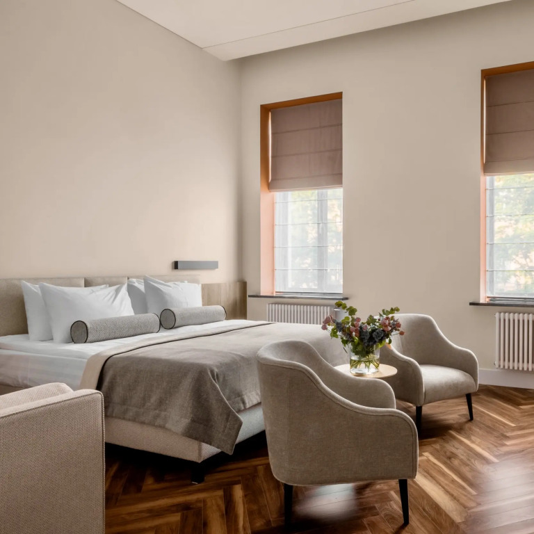 Зона кухни оснащена набором посуды и приборами, а также варочной поверхностью и посудомоечной машиной. Ванные комнаты всех номеров укомплектованы туалетными принадлежностями, халатом и тапочками. В каждом номере есть чайная станция, в номерах категорий Deluxe, Suite и клубном номере — кофемашина.
