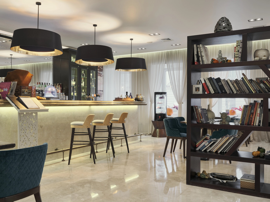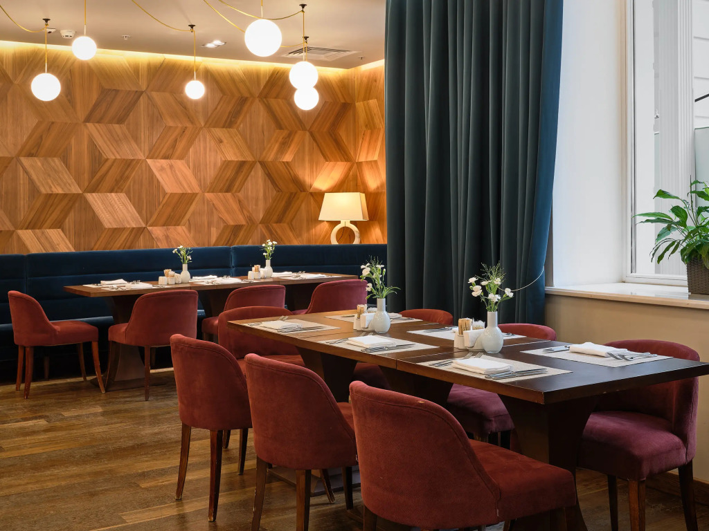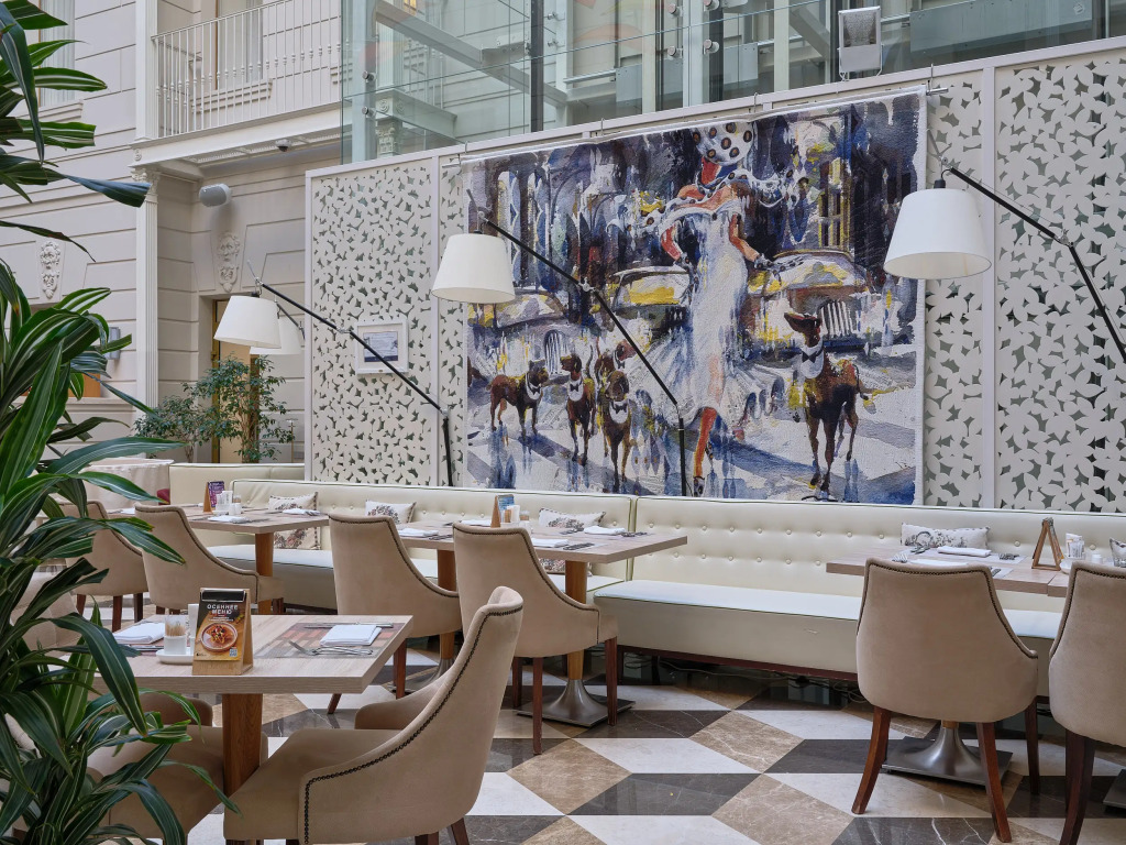 Интерьер большого атриума, где в ресторане «Вино & Вода» подается завтрак «шведский стол», украшен инсталляциями голландского скульптора Питера Гентенара, подчеркивающими объём пространства. Потоки света, льющиеся с 25-метровой высоты через стеклянную крышу, и белый мрамор пола поддерживают атмосферу роскоши и элегантности. На крыше отеля работает панорамная терраса, с которой открывается вид на достопримечательности культурной столицы: Исаакиевский собор, храм Спаса на Крови, Петропавловскую крепость, крейсер «Аврора», Смольный собор и Лахта-Центр.