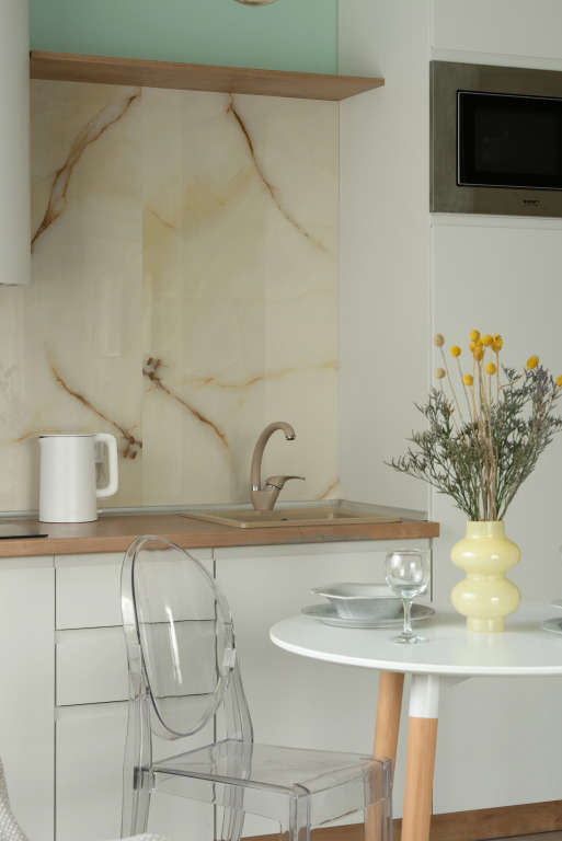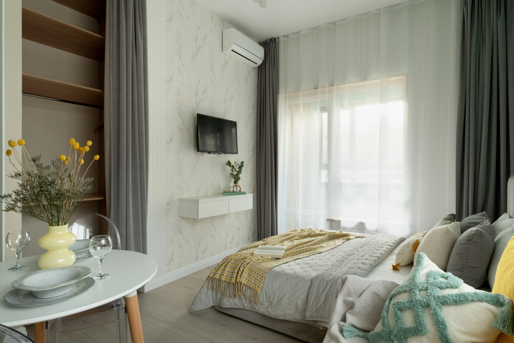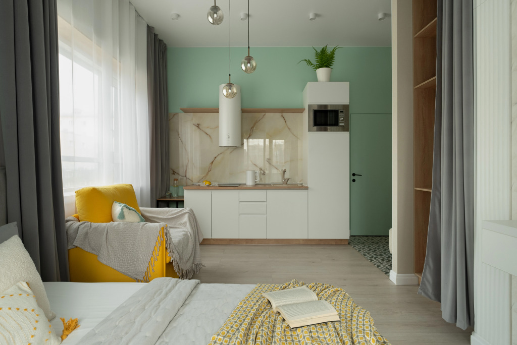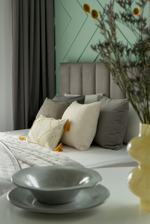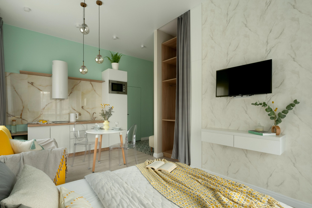 В распоряжении гостей: двуспальная кровать с ортопедическим матрасом и постельным бельём, шторы блэкаут, кресло-кровать — дополнительное спальное место, мебель и оригинальный декор. Также доступны: телевизор со Smart TV, кондиционер, стиральная машина, чайник, электрическая плита, микроволновая печь, холодильник, бойлер, фен, утюг и сушилка для белья. Безлимитный Wi-Fi обеспечит гостям связь с миром. Есть кухонная зона с посудой и кухонными принадлежностями для приготовления еды. В ванной комнате имеются душевая кабина, сантехника, полотенца и косметические средства: шампунь, гель для душа, мыло и туалетная бумага.