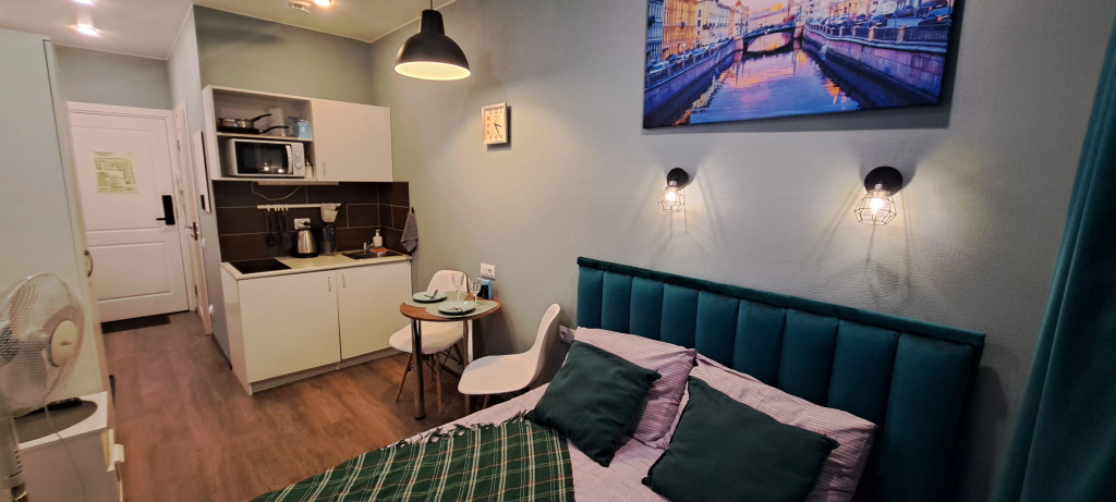 В апартаментах установлена кровать с усиленным каркасом и ортопедическим матрасом. В каждой квартире-студии на кухне есть плита, холодильник, микроволновая печь, чайник, кухонные принадлежности, сковорода, кастрюля, ковшик, посуда. В собственной ванной комнате имеется туалет, раковина, душевая кабинка, фен, большие и маленькие полотенца для гостей, гель для душа, жидкое мыло для рук. В распоряжении гостей: телевизор, бесплатный Wi-Fi, утюг, гладильная доска, сушилка для белья, напольный обогреватель. По запросу возможно предоставление второго одеяла. Стиральные машины расположены в общей зоне. Возможно проживание с животными за дополнительную плату. Парковочные места находятся напротив дома.