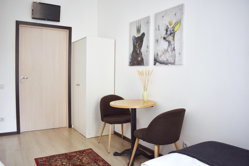 Комната очень светлая и уютная, удобная кровать, есть столик, два стула, зеркало с полочкой под ним, что крайне удобно, шкаф , тумба и телевизор. Окна выходят во внутренний дворик, но помещение хорошо освещено дневным светом.