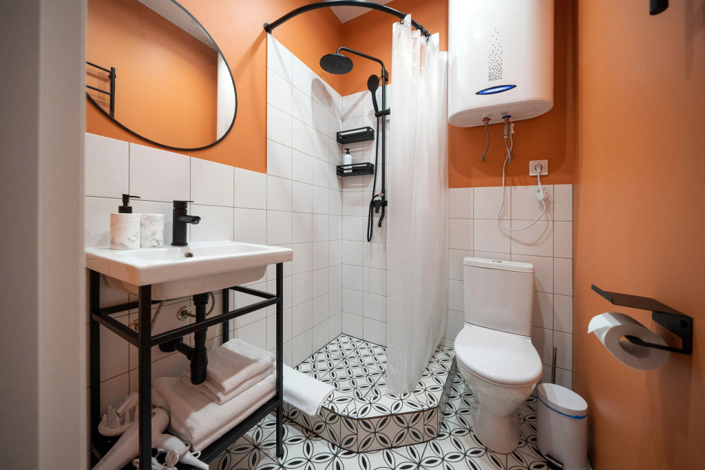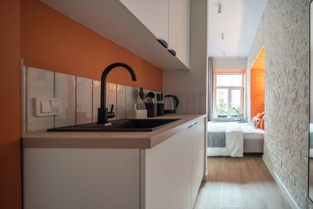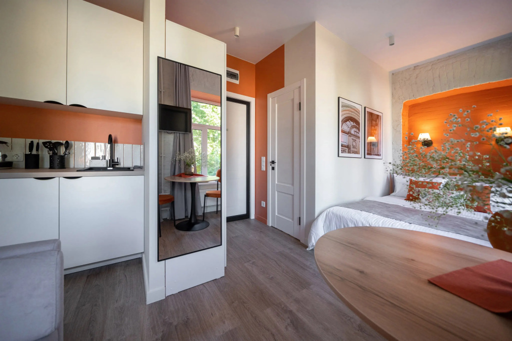 В категориях «cтудия Superior» и «одноместная студия», нельзя выбрать определенную студию. У части студий окна выходят на ул. Маяковского, у другой на тихий двор. На фото представлены все варианты студий в данной категории. Студии идентичны, одинаковые дизайн и меблировка, но разная расстановка мебели. В некоторых студиях шкаф, в некоторых — рейл. Гостей просят внимательно ознакомиться с описанием и условиями бронирования.