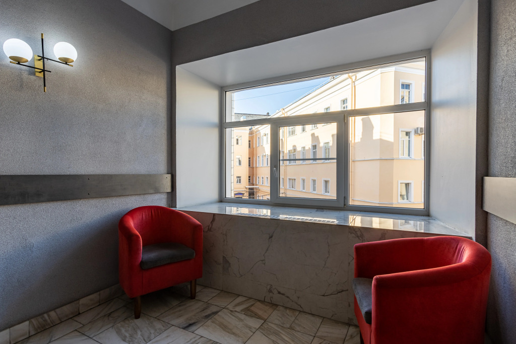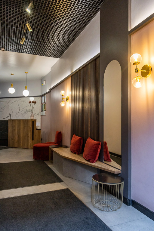 Вход в отель находится со стороны улицы Гончарной, д. 26.