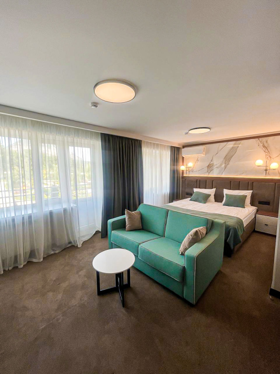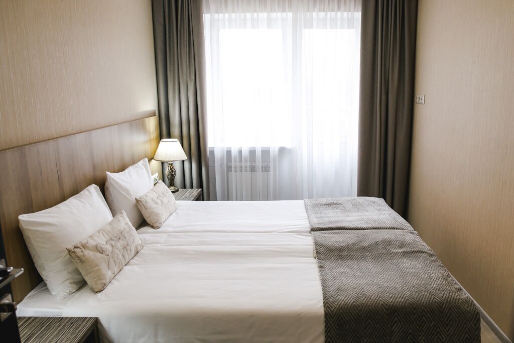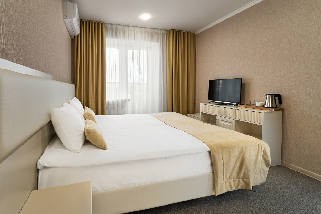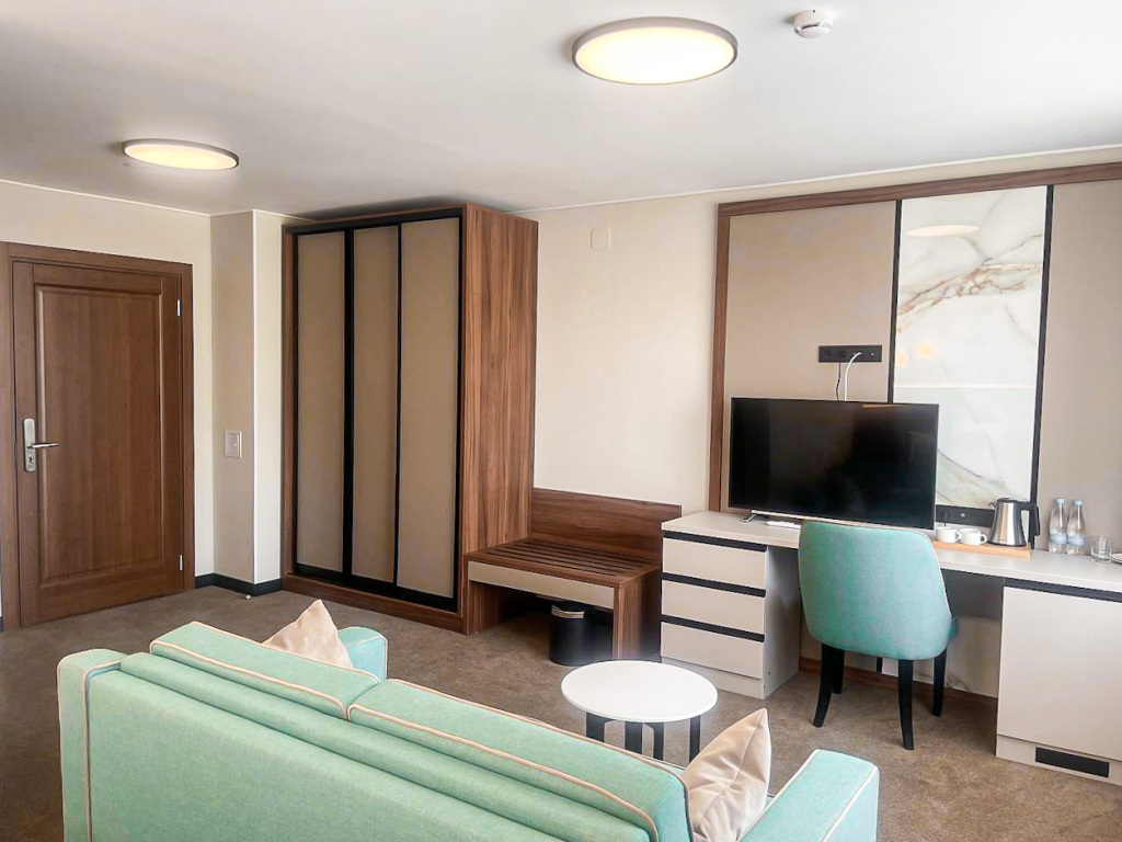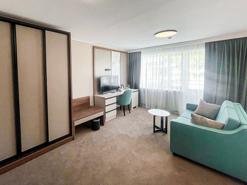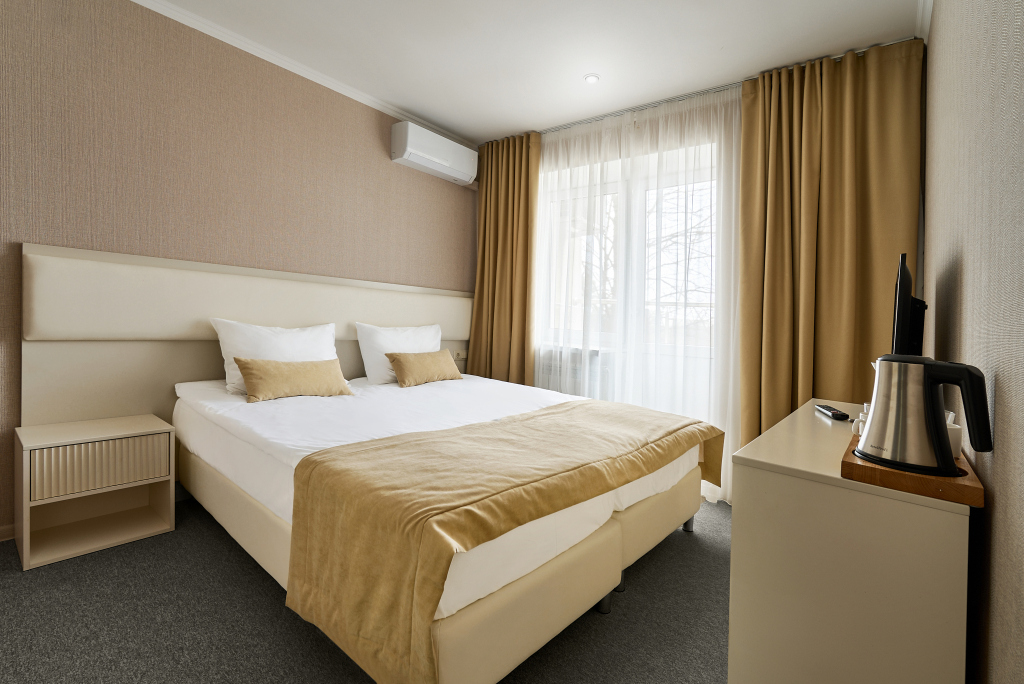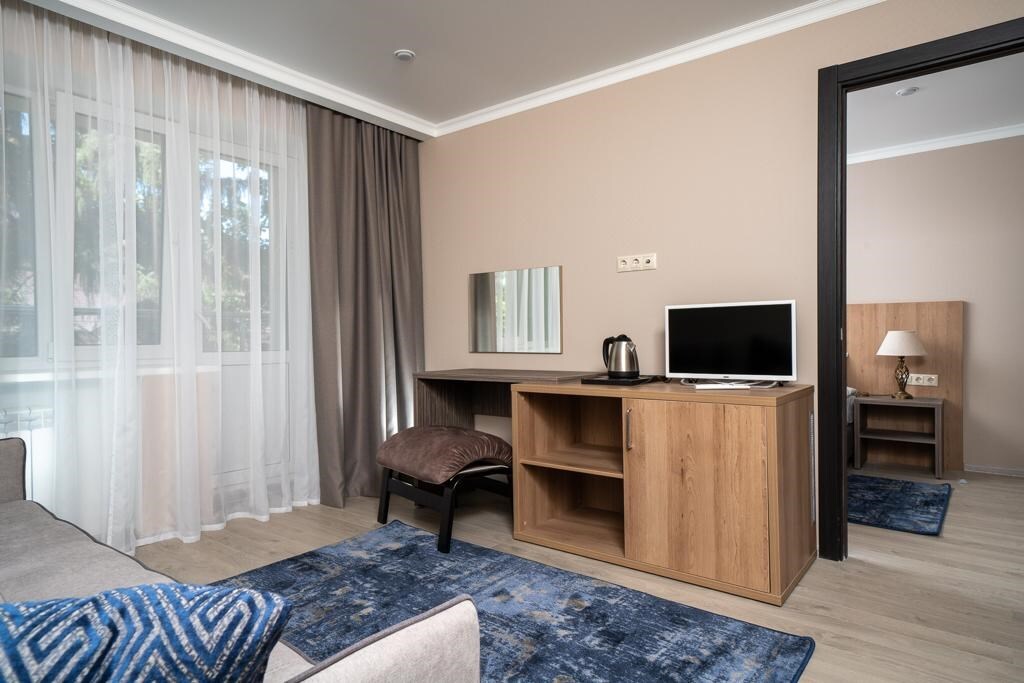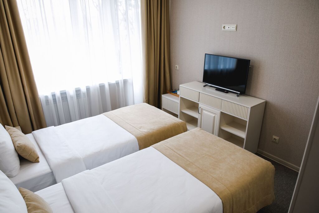 95 номеров санотория функционируют круглогодично. Во всех номерах: балкон, двуспальная или две односпальные кровати, кондиционер, телевизор, сейф, чайник, чайный набор, санузел с душевой кабиной, фен, тапочки, халат, косметические принадлежности.