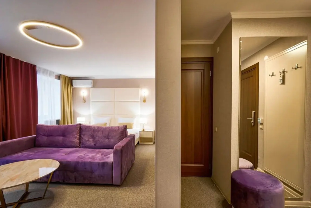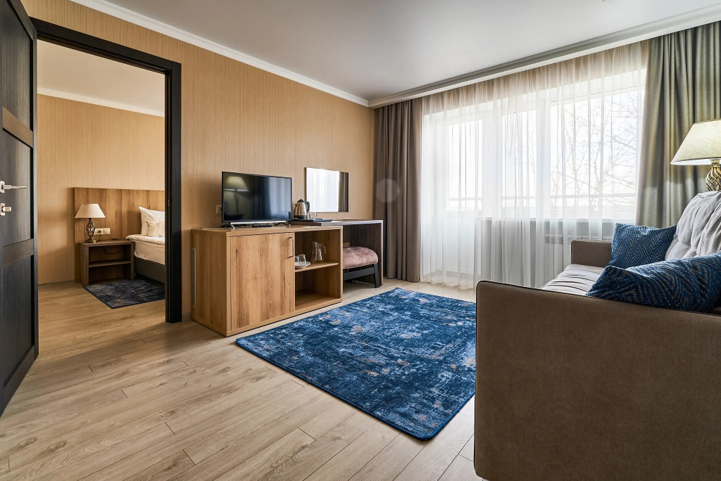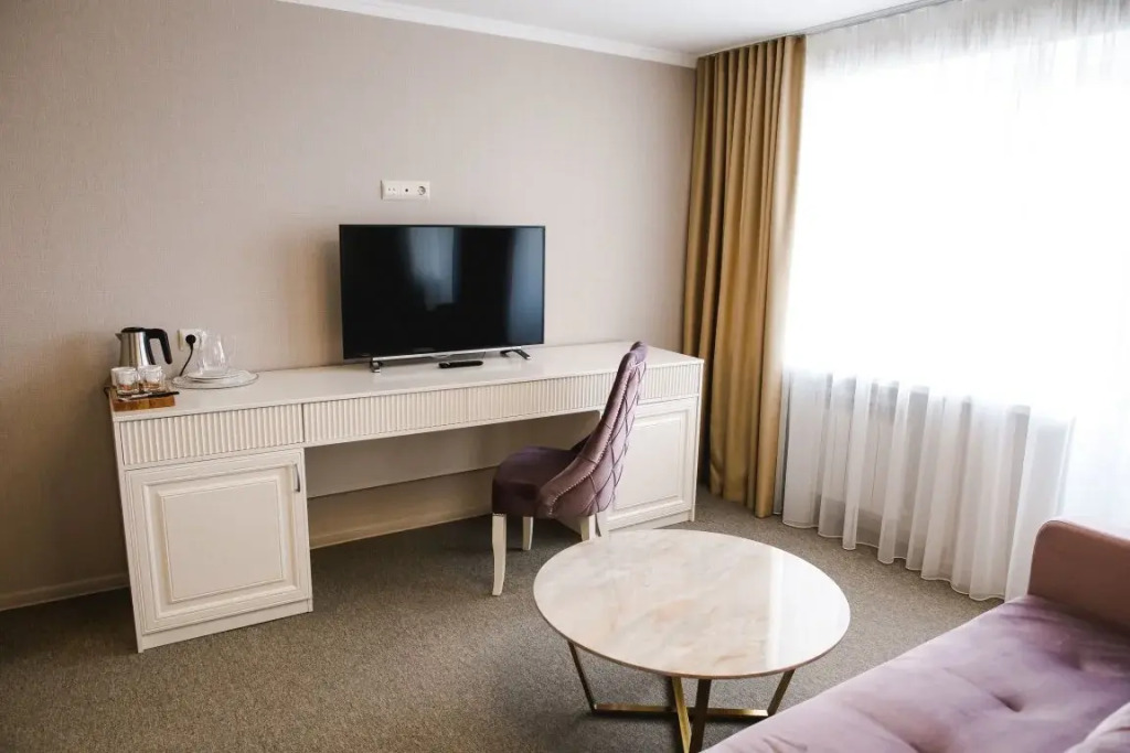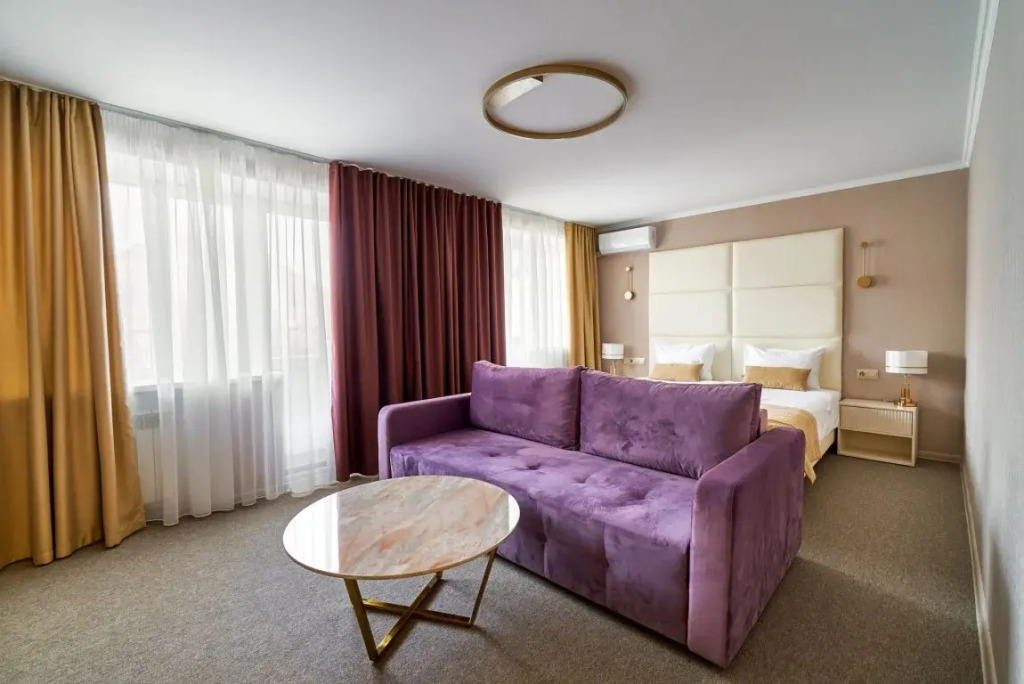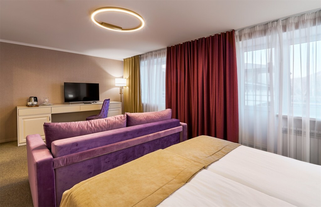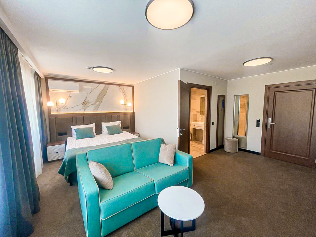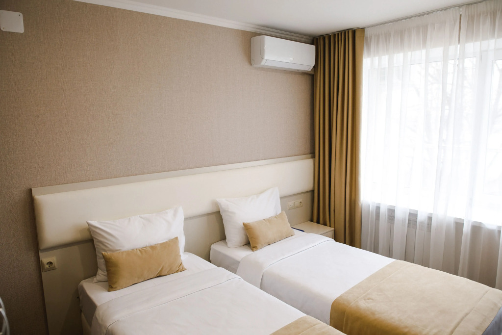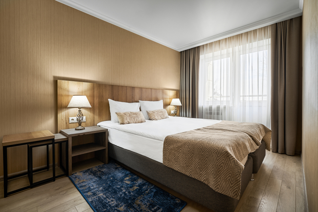 95 номеров санотория функционируют круглогодично. Во всех номерах: балкон, двуспальная или две односпальные кровати, кондиционер, телевизор, сейф, чайник, чайный набор, санузел с душевой кабиной, фен, тапочки, халат, косметические принадлежности.