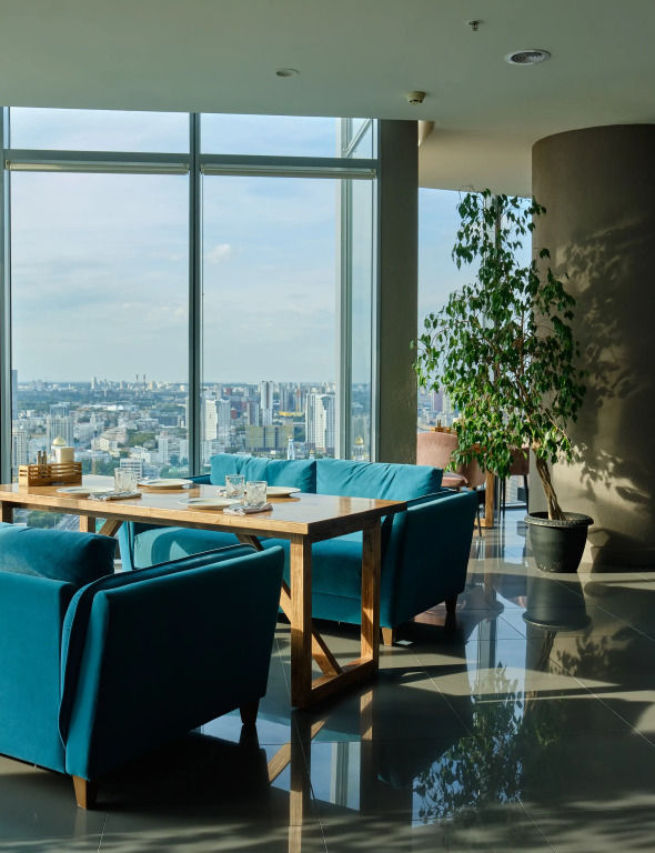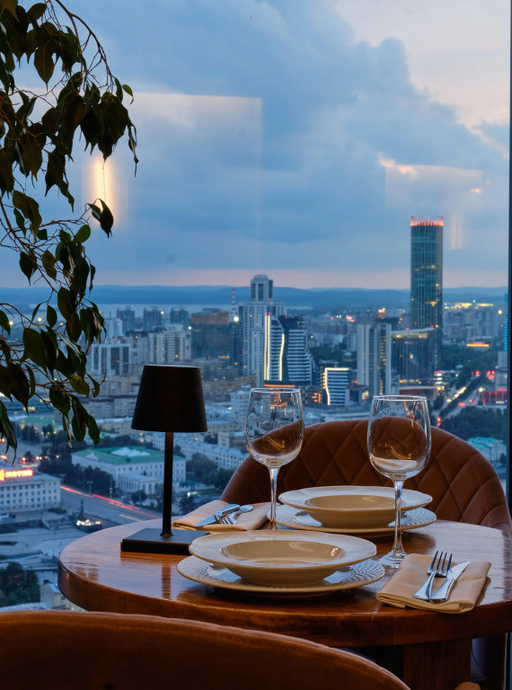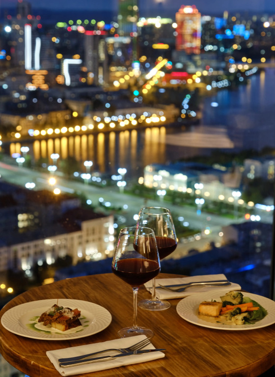 Для гостей открыт панорамный ресторан «Влади» с европейской кухней. К услугам гостей также кафе с лёгкими закусками. В стоимость номера входит завтрак «шведский стол».