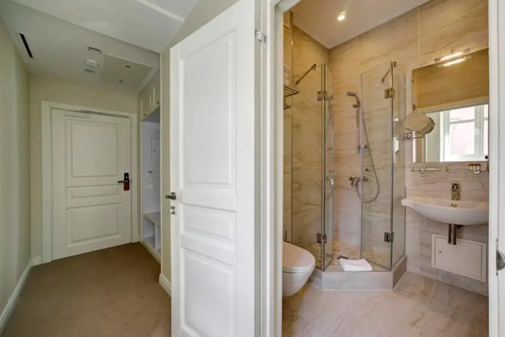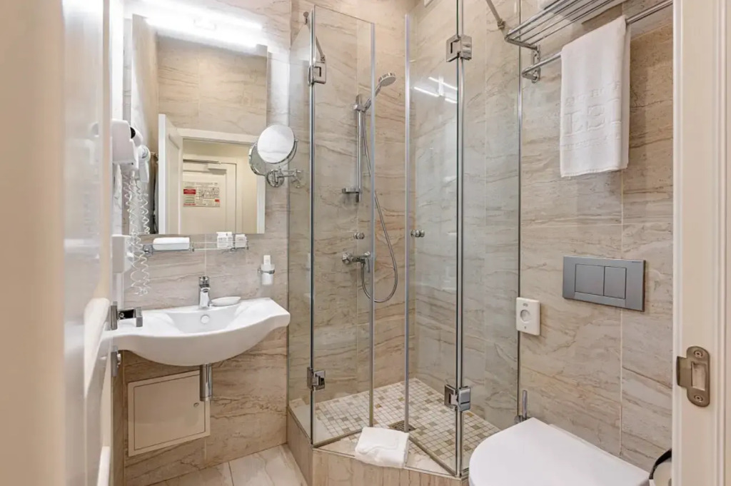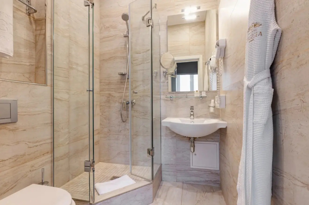 Собственная ванная комнате с современной душевой кабиной, предоставляются халаты, тапочки, бесплатные туалетно-косметические принадлежности и фен.