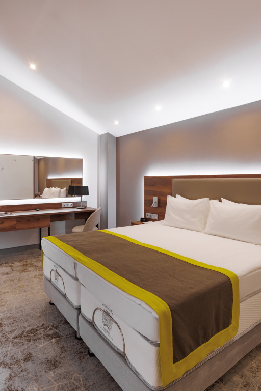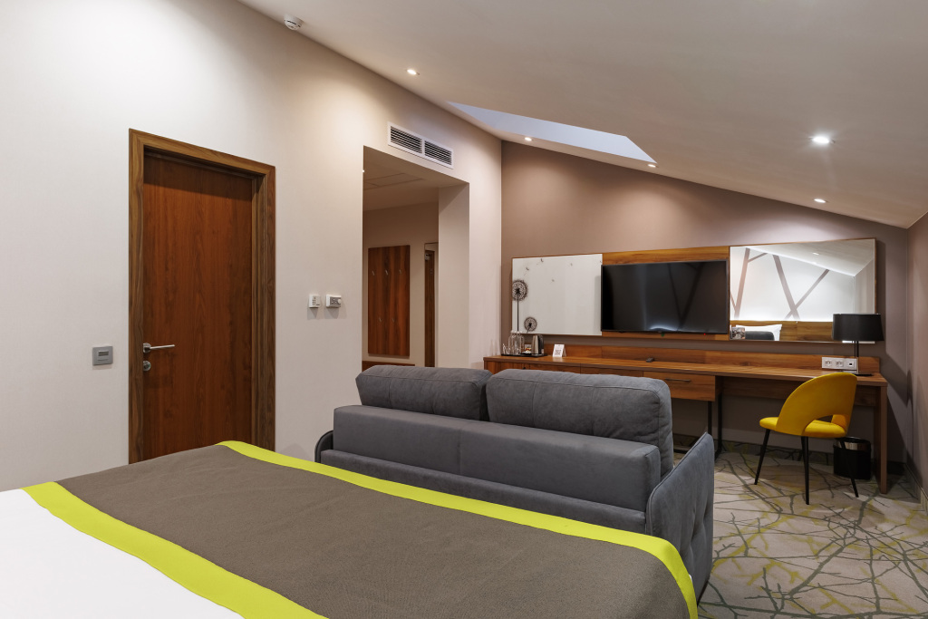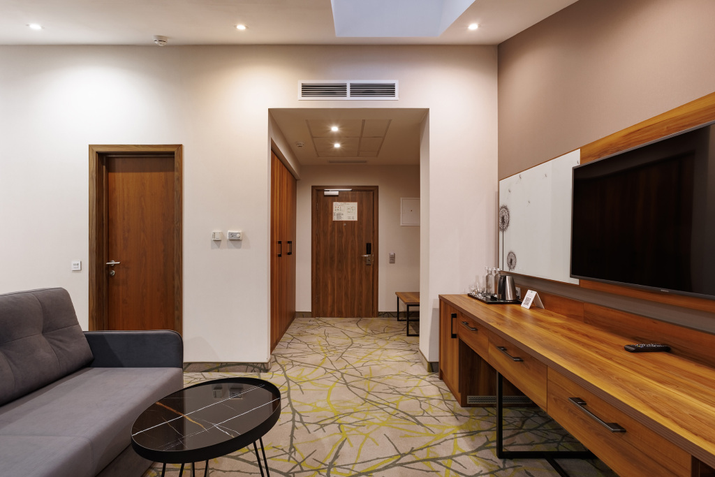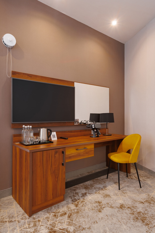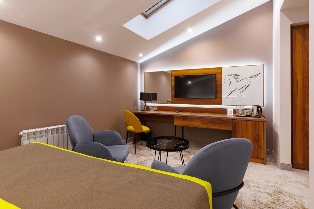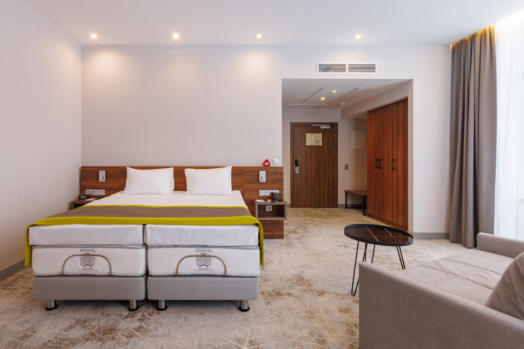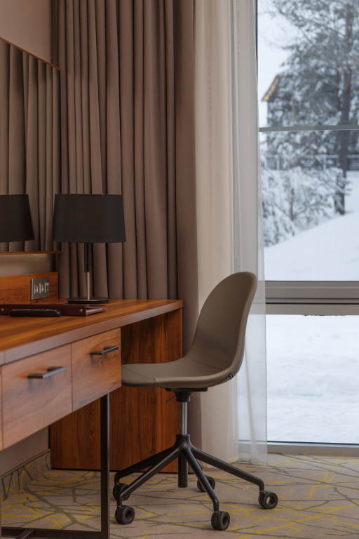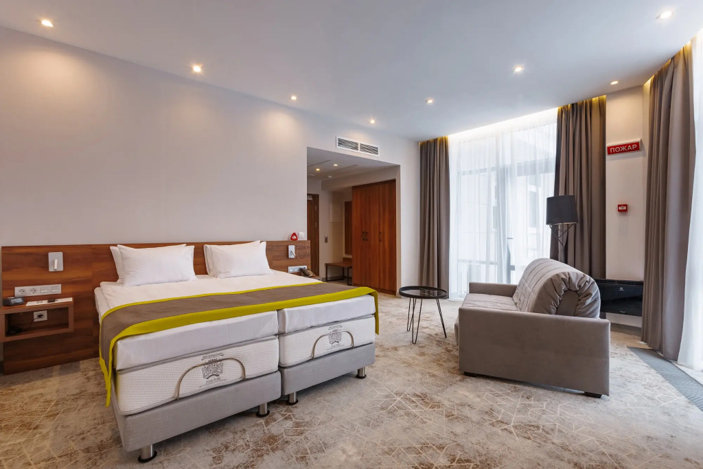 Номер обставлен и оснащён необходимым, чтобы отдохнуть после долгого и насыщенного дня. Имеются будильник, телевизор, мини-бар, халат и тапочки. Оснащение зависит от выбранной категории номера. Размещение с домашними животными запрещено.