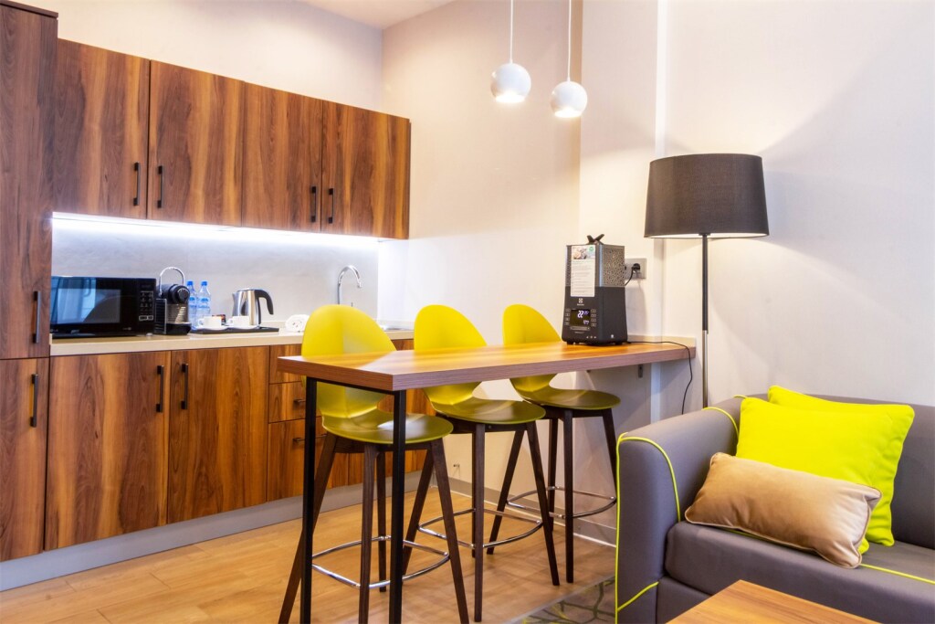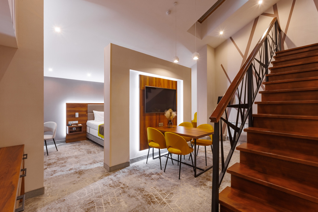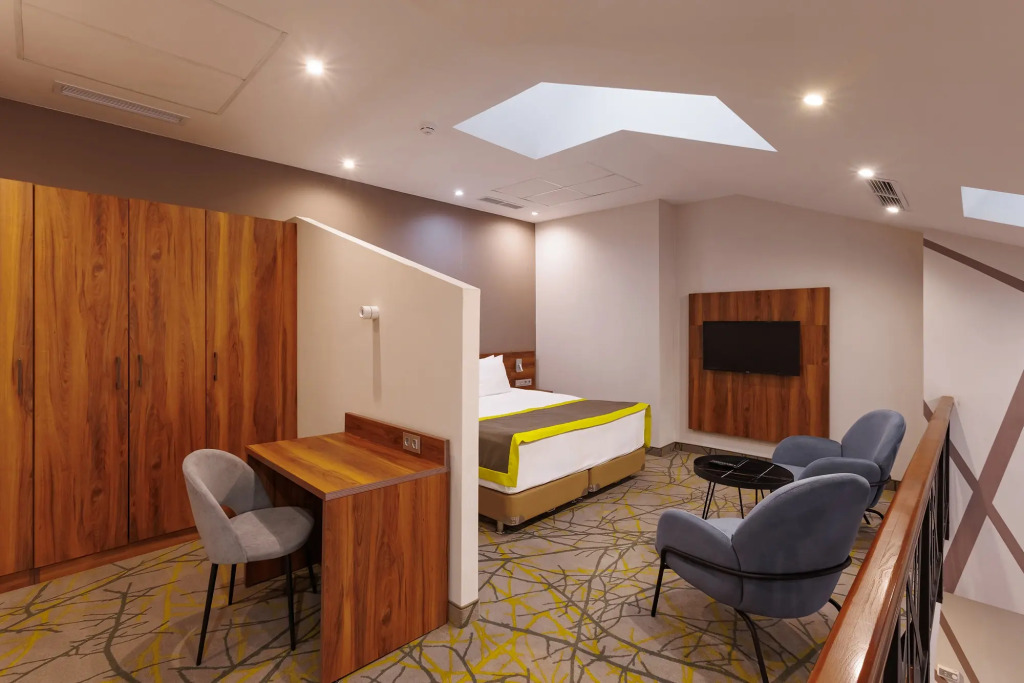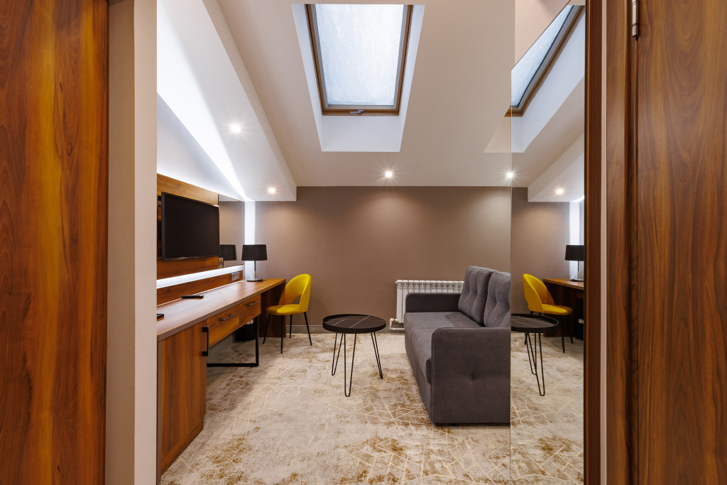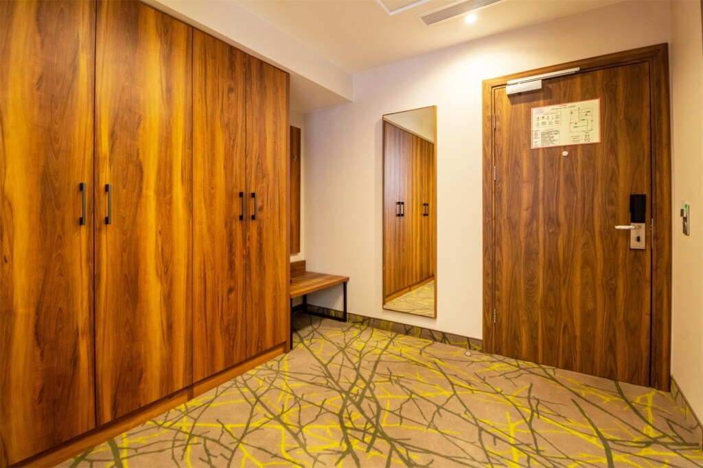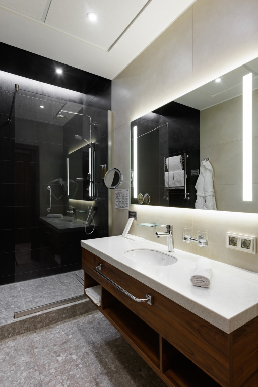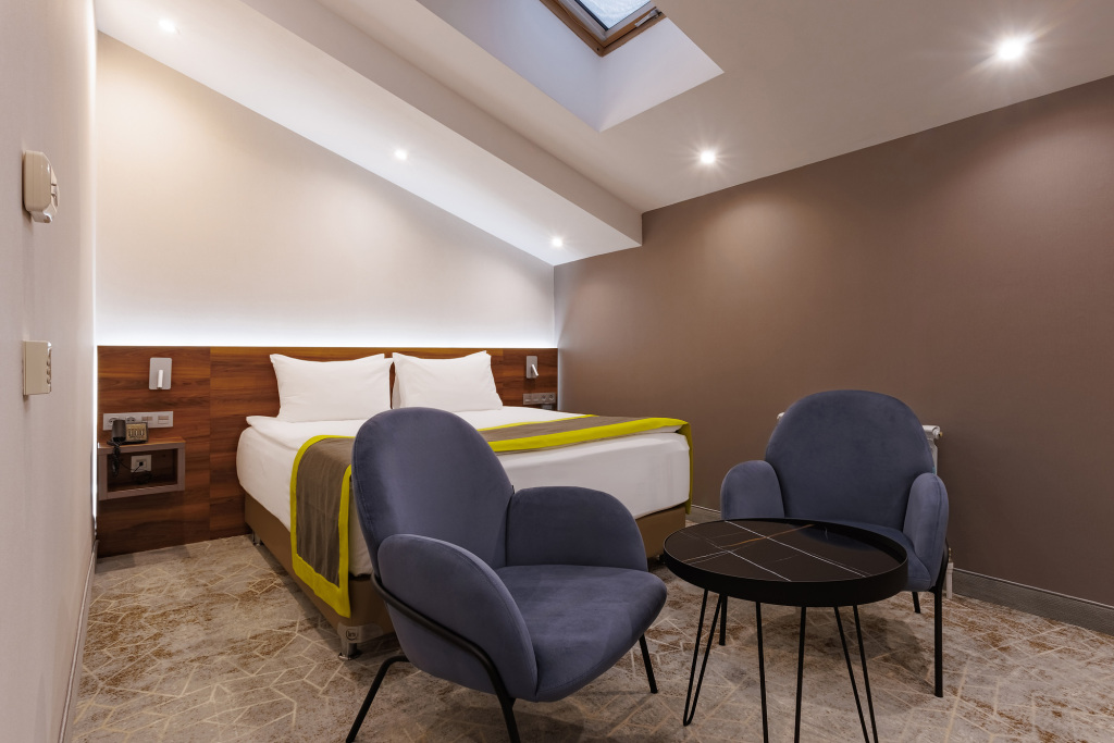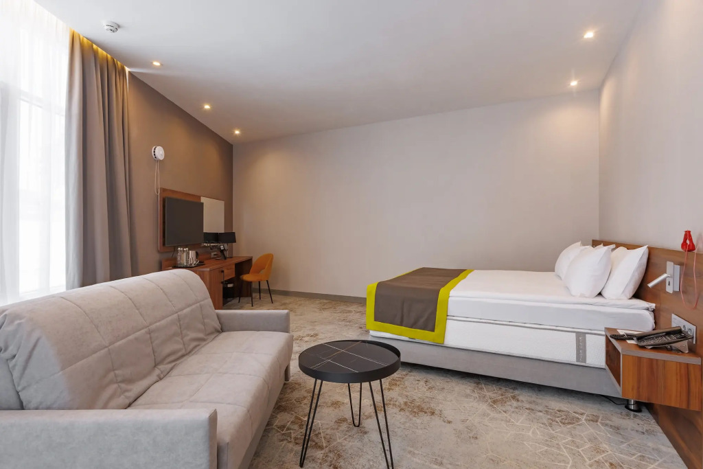 Номер обставлен и оснащён необходимым, чтобы отдохнуть после долгого и насыщенного дня. Имеются будильник, телевизор, мини-бар, халат и тапочки. Оснащение зависит от выбранной категории номера. Размещение с домашними животными запрещено.